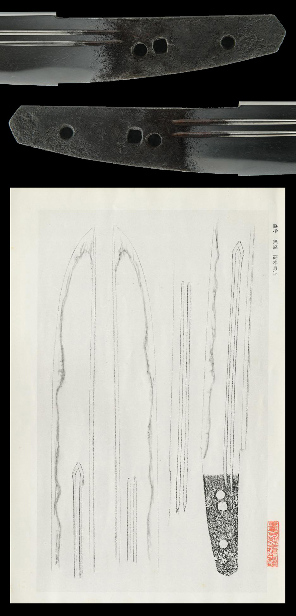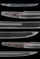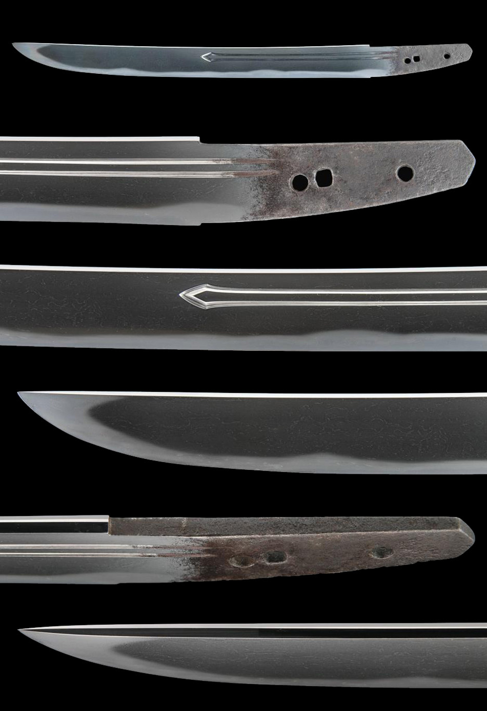 刃長:Blade length(Cutting edge): 31.8cm(一尺〇寸五分弱) 反り:Curve(SORI): 0.4cm 体配:Shape(Taihai): 平造り。三つ棟。
