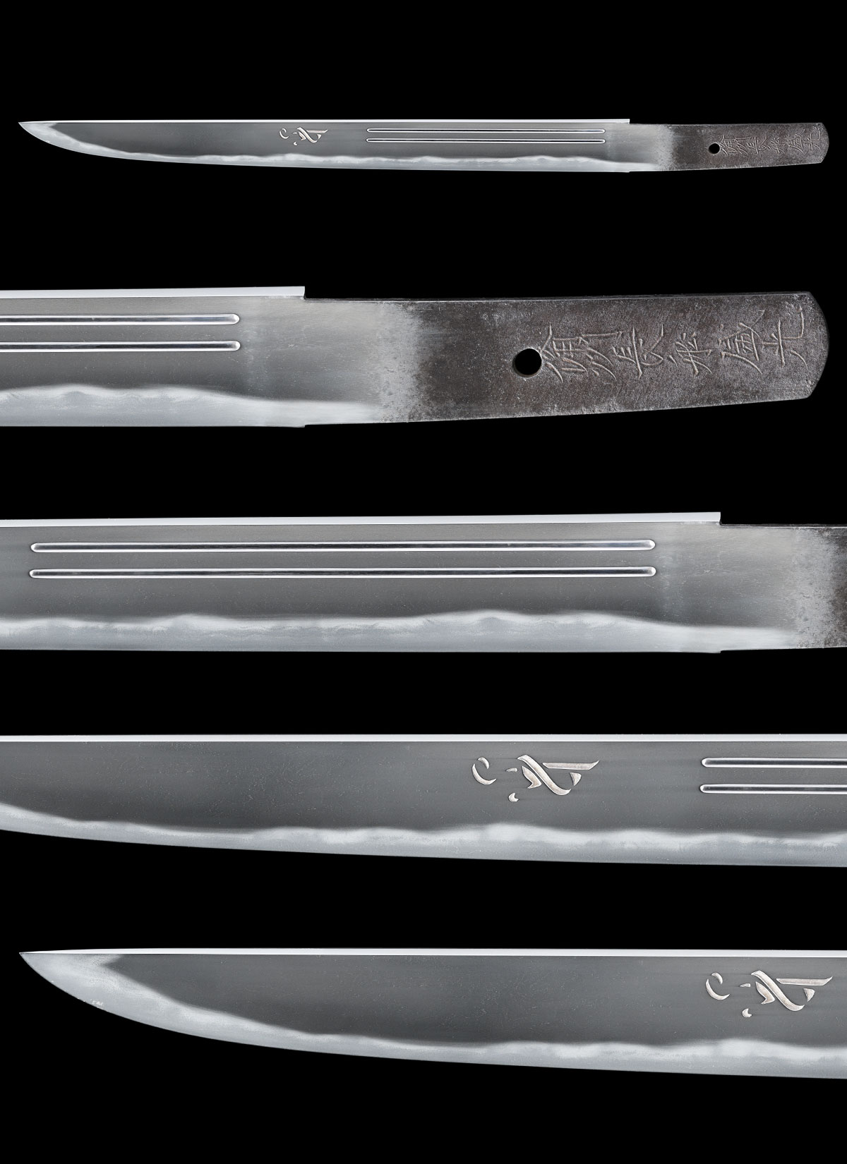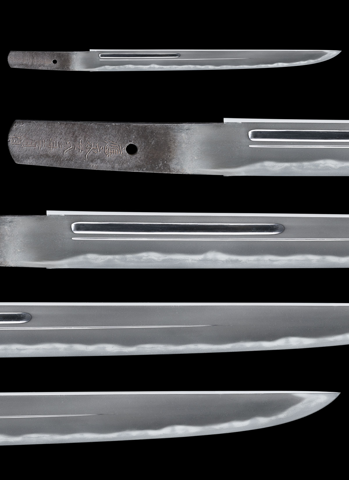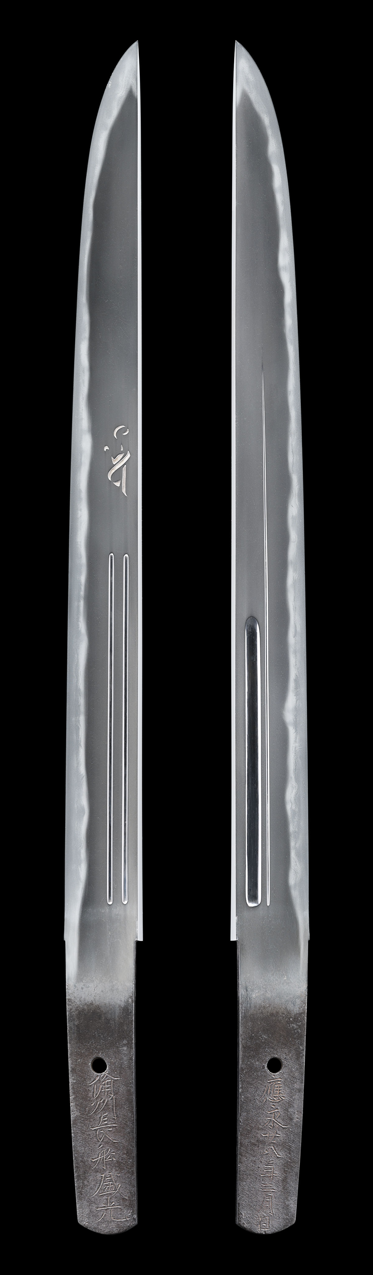 体配:Shape(Taihai): 平造、庵棟。 彫物:Engraving: 差表に梵字と護摩箸、差裏に腰樋と添樋の彫刻を施す。 地鉄:Jigane(Hada):板目肌に杢目交じり、良く練れて詰み、映り明瞭に立つ。 刃文:Temper patterns(Hamon): 小互の目乱れを主として、小乱れ刃、丁子刃などが交じる。 帽子:Temper patterns in the point(Bohshi): 乱れ込み先尖りごころとなり僅かに返る。 登録:Registration Card: 福岡県 昭和二十六年
