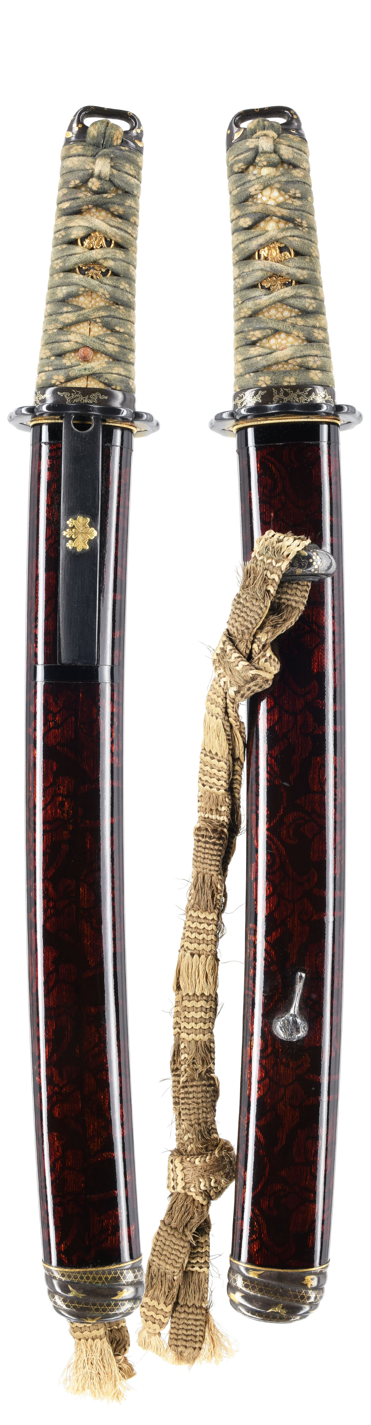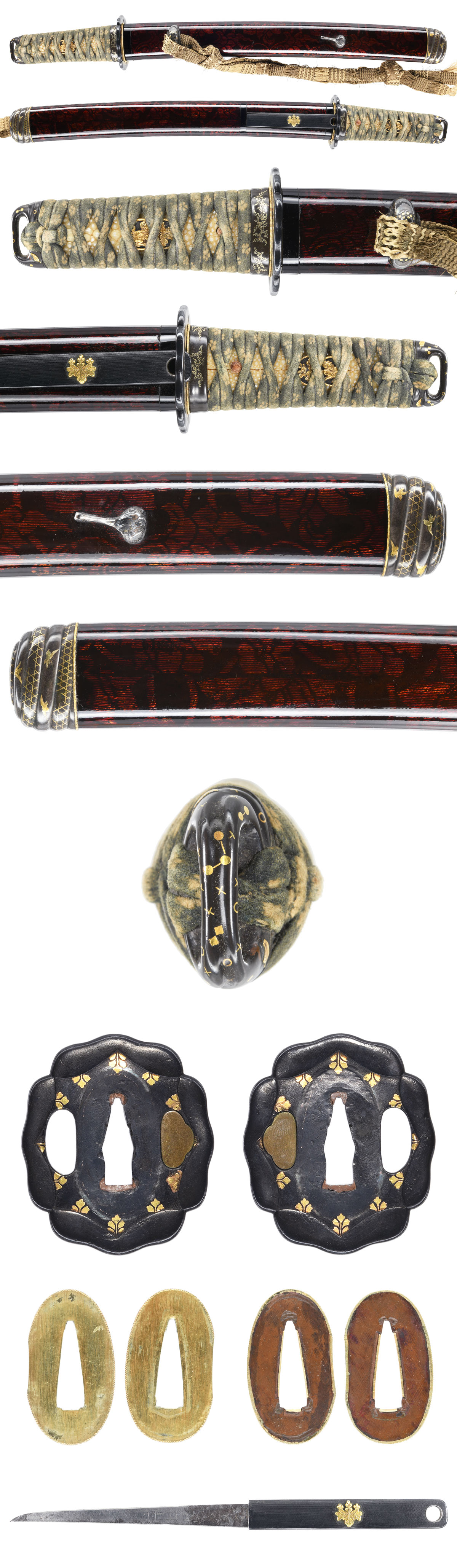 刃長:Blade length(Cutting edge):約29.3cm(九寸七分弱) 反り:Curve(SORI):0.0cm 元幅:Width at the hamachi(Moto-Haba): 2.59cm 元鎬重:Thickness at the Moto-Kasane: 0.62cm 先幅:Wide at the Kissaki(Saki-Haba): 2.10cm 先鎬重:Thickness at the Saki-Kasane: 0.45cm 拵全長:Length of Koshirae: 約45cm 茎:Sword tang(Nakago): 生ぶ、筋違鑢目、目釘穴1個。