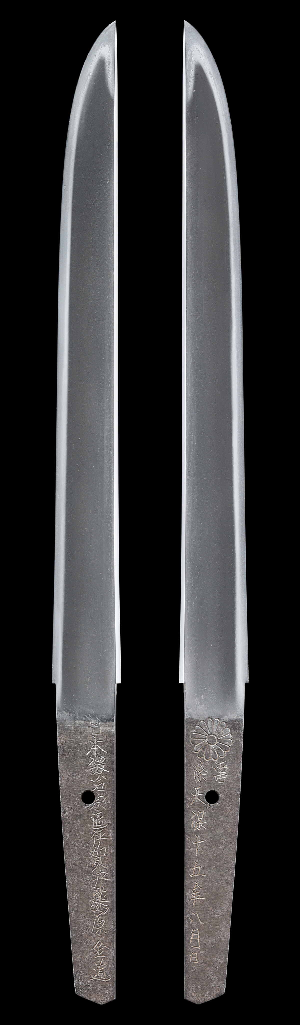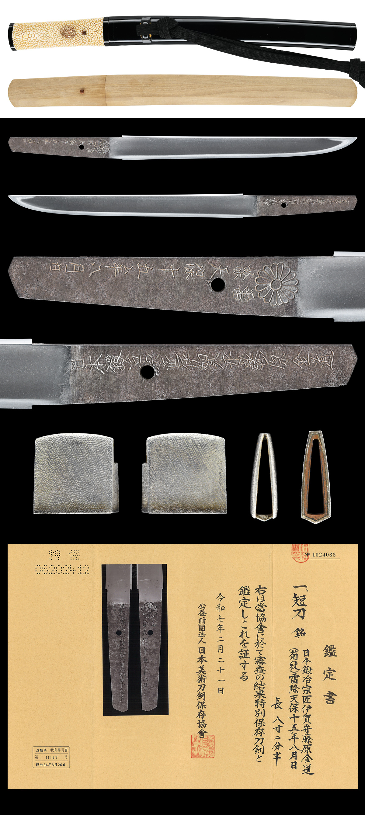 【解説】 室町末期、濃州関兼道(大道)の子 長男 初代伊賀守金道は、兄弟(次男 来金道、三男 丹波守吉道、四男 越中守正俊)と共に山城国に移住します。他説を有しますが、父兼道をはじめ、四兄弟は京五鍛冶とも称されます。彼らは江戸期において一大派閥である三品一門の源流とされています。なかでも初代伊賀守金道は、一派の筆頭として天皇家や幕府への功績、鍛刀の技を認められ、「日本鍛冶惣匠」の名を切る事を許され、以後同家は全国の刀鍛冶の受領銘の事を司っています。二代以降は、伊賀守の受領銘とともに「日本鍛冶惣匠」と茎に切り始めます。本品は銘鑑より、同家九代目 伊賀守金道の作とみられます。 本作は、刃長が八寸二分半、身幅尋常に、重ねやや薄め、すらりとした気品のある刀姿を呈す平造姿の一口です。地鉄は、小板目肌に処々流れ肌交じり、総体綺麗に詰んで、地沸付き、細かに地景が入ります。刃文は、小沸出来の直刃が良く冴えて焼かれます。帽子はそのまま直ぐで、先小丸に返ります。茎は生ぶ、浅い勝手下がり鑢目で、刀工銘と年紀、菊紋、雷除と刻します。また菊紋の下に刻された「雷除」は、五代目より切り添えられるようになったと伝えます。本刀は、天保十五年紀の伊賀守金道の一口。黒蠟色塗の短刀拵と合わせて上品にまとまった御刀としてご紹介いたします。白鞘、銀着一重はばき、黒蠟色塗鞘合口短刀拵、特別保存刀剣鑑定書。