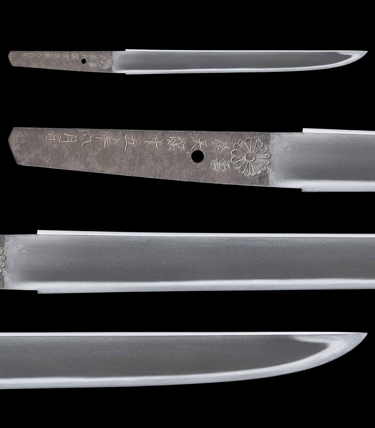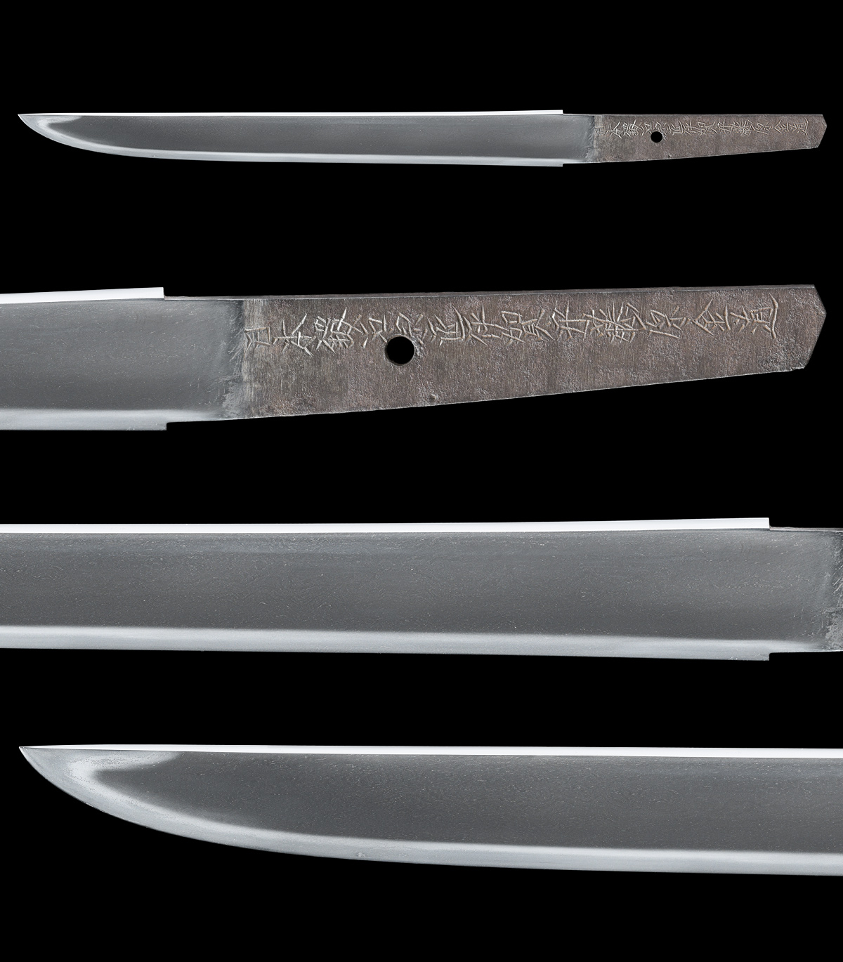 刃長:Blade length(Cutting edge):25cm(八寸二分半) 反り:Curve(SORI):0cm 元幅:Width at the hamachi(Moto-Haba): 2.62cm 元鎬重:Thickness at the Moto-Kasane: 0.51cm 先幅:Wide at the Kissaki(Saki-Haba): 2.20cm 先鎬重:Thickness at the Saki-Kasane: 0.40cm 拵全長:Length of Koshirae: 約39cm 茎:Sword tang(Nakago): 生ぶ、勝手下がり鑢目、目釘穴1個。