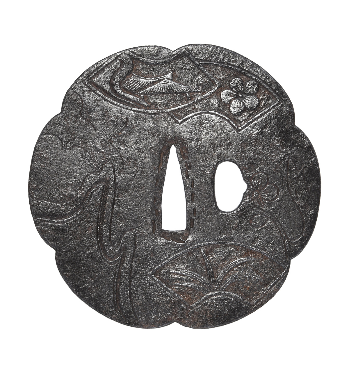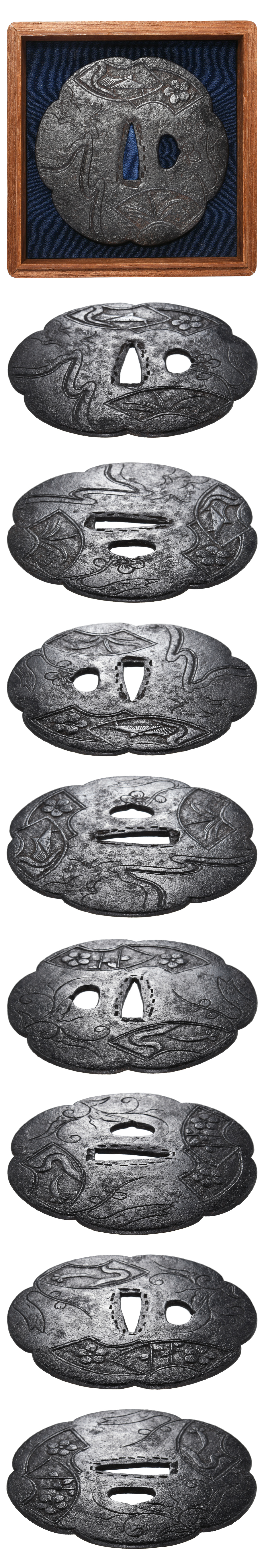 扇面散図鍔 六ツ木瓜形 鉄地 鋤出毛彫 丸耳 |