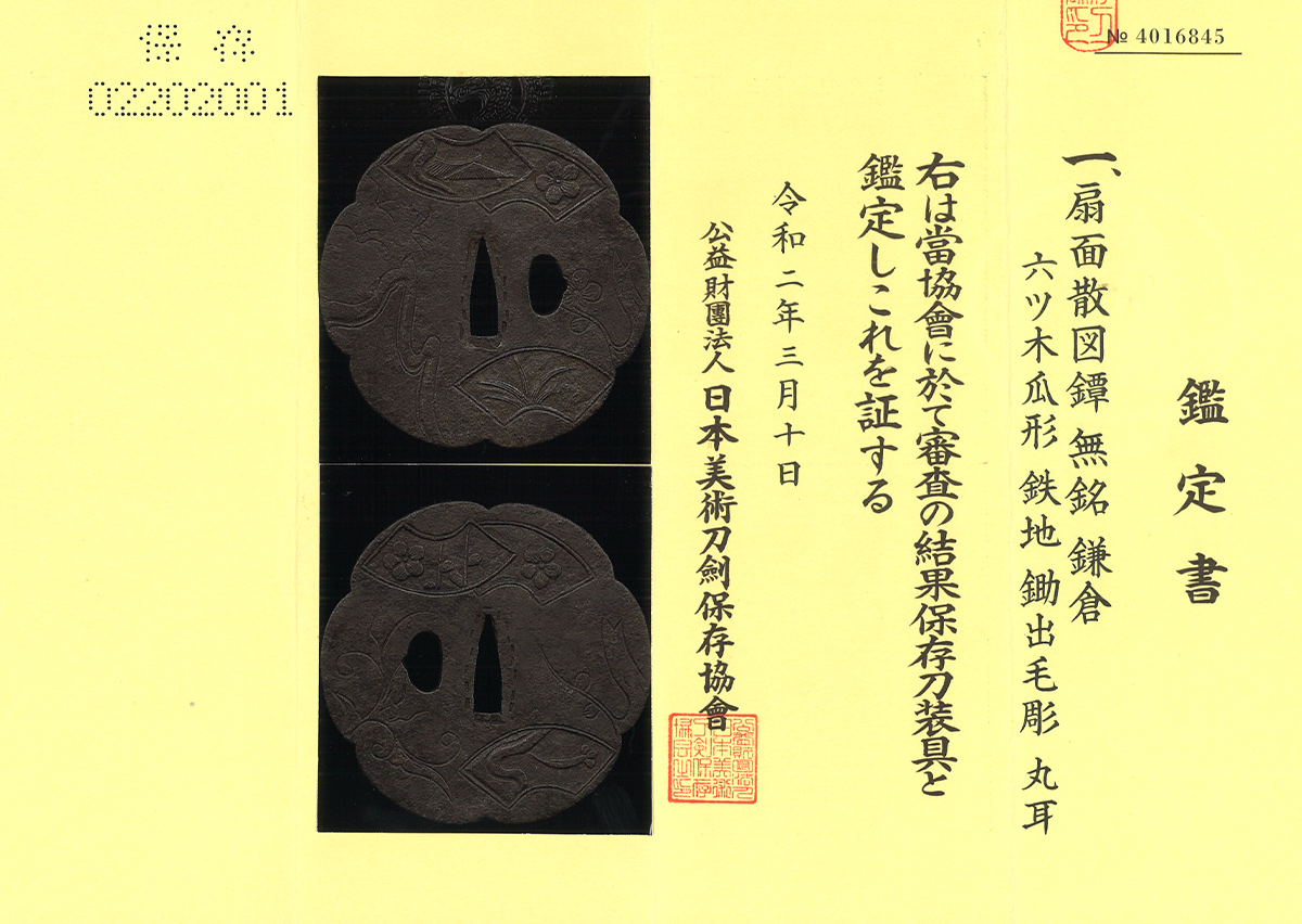 鍔 無銘 鎌倉 扇面散図鍔 保存刀装具鑑定書
