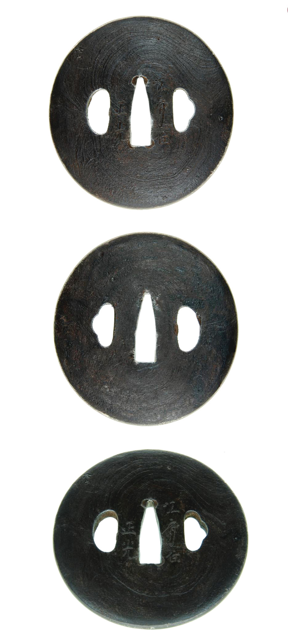 【解説】江府住 正光 鍔一面に鍛模様が現れた味わい深い鍔です。鉄味が良く艶やかで魅力十分。 |