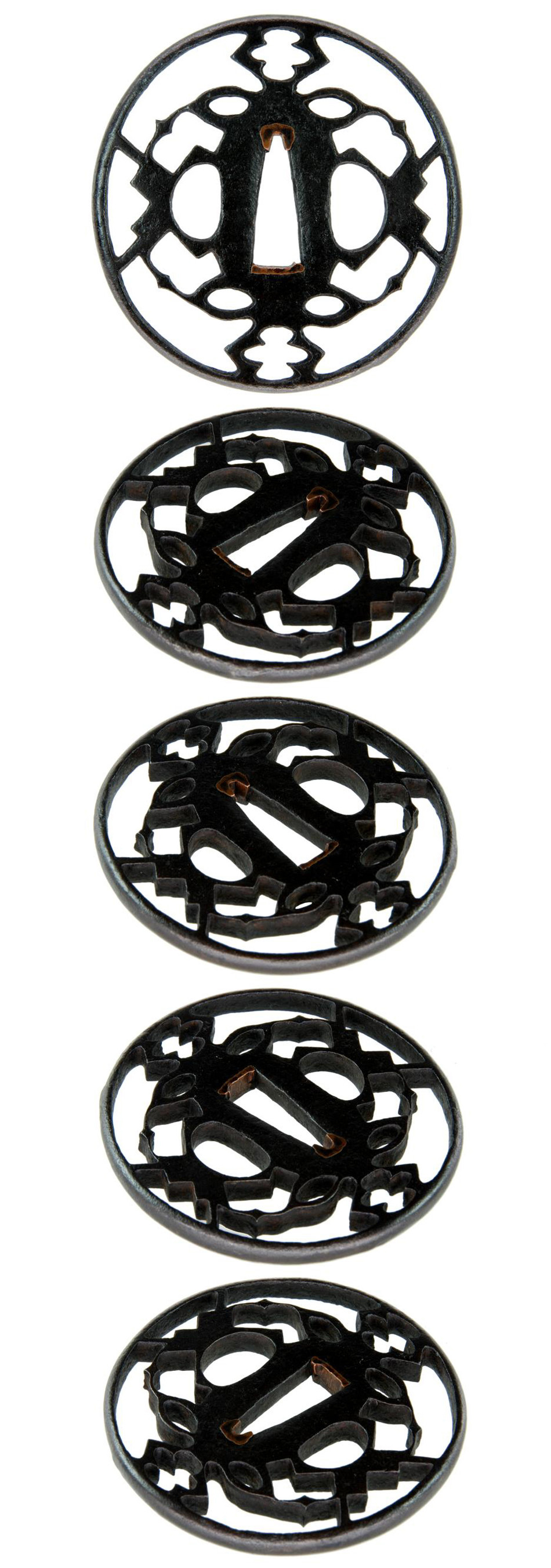 【解説】製作地は尾張、美濃あたりというのが定説になっています。製作された時代は室町中期からで、戦国時代が全盛期と考えられています。時代が下がると尾張透し鍔に近い雰囲気となり特色に欠けてきます。作風は質素で剛健な感じがするものであり、出来は丸型が多く厚みがあり、小ぶりで、黒味がついた鉄で、焼が極めて強いと考えられています。構図は直線、曲線、菱などで無骨で一見単調に見えてしまいがちですがプロ好みする雅趣深い味わいがあります。 全てのVISAカード、Masterカード、NICOSカード、UFJカード、DCカード、