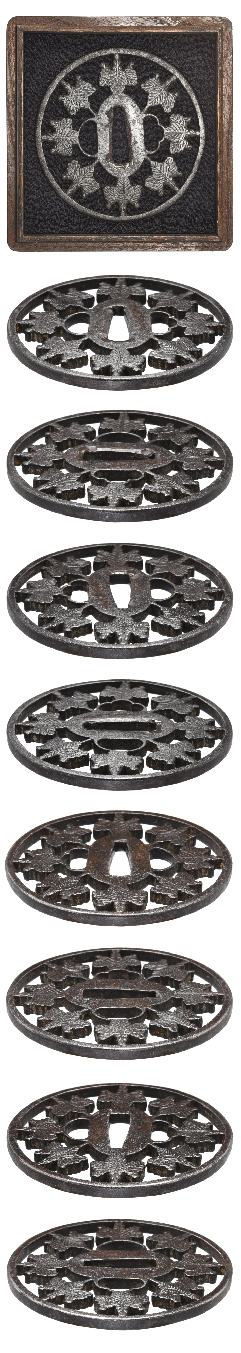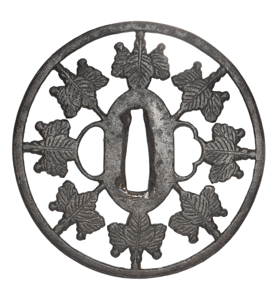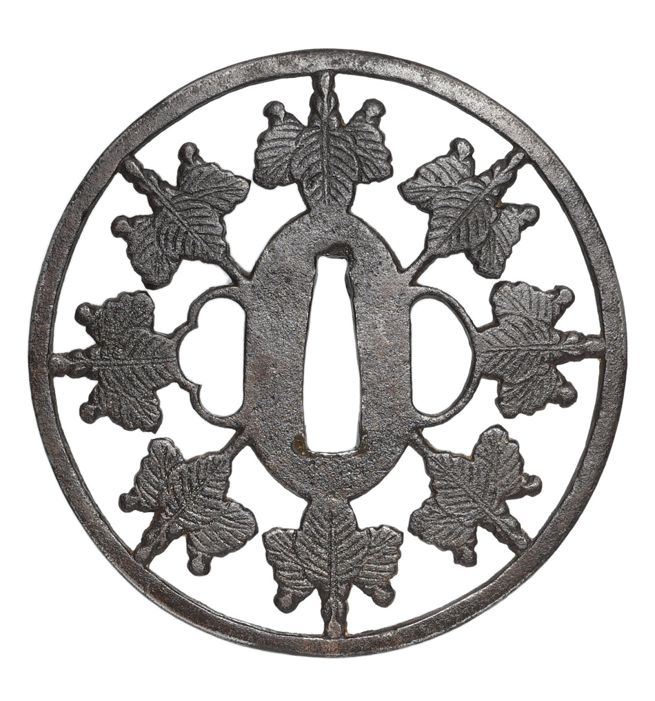 桐紋繋透鍔 竪丸形 鉄磨地 地透毛彫 角耳小肉 両櫃孔 |