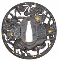 桜花馬牛図 竪丸形 鉄地 肉彫地透 金象嵌 大両櫃孔埋 小両櫃孔内笄櫃孔埋 【大鍔】
