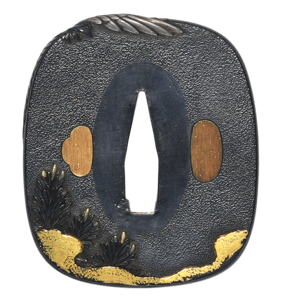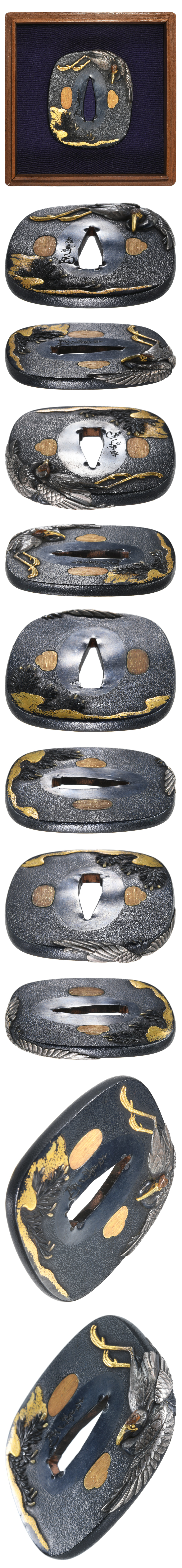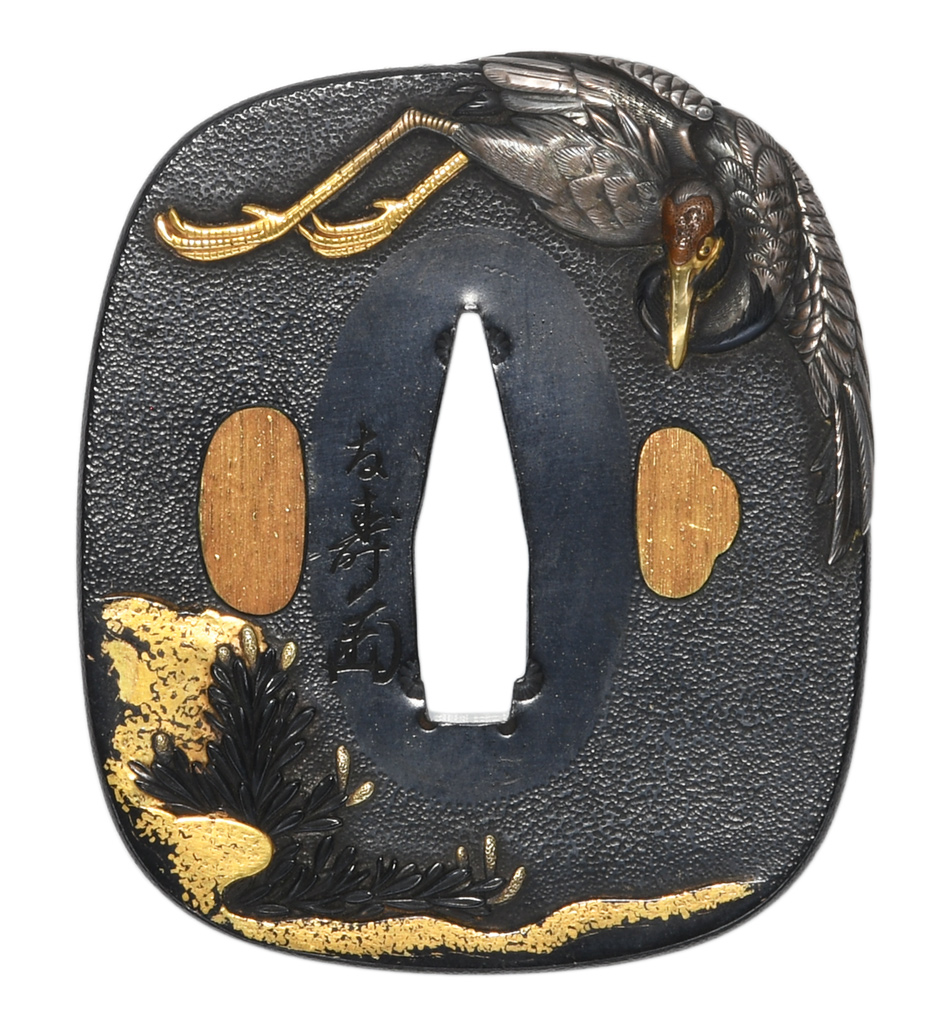 松鶴図鍔 障泥形 赤銅石目地 高彫 象嵌色絵 肉彫耳 |