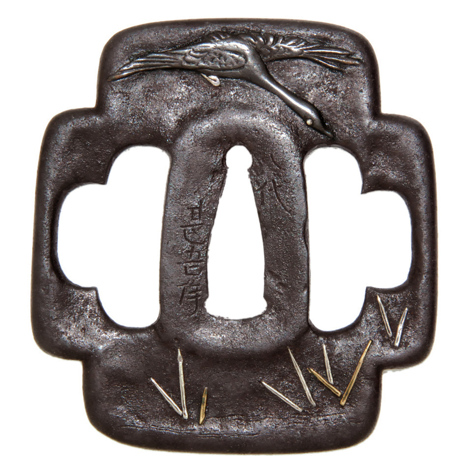 鍔 銘 八代甚吾作 芦雁図鍔 保存刀装具鑑定書