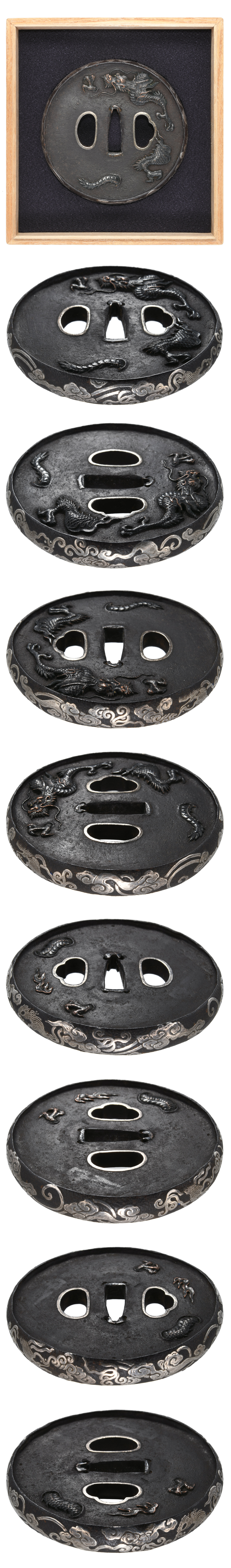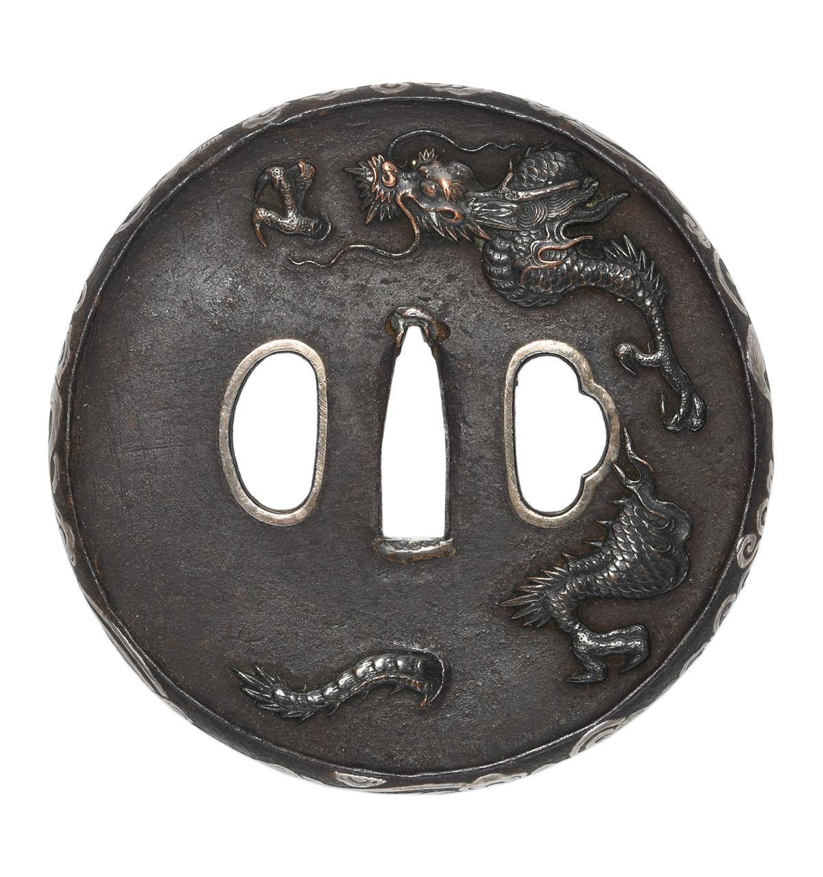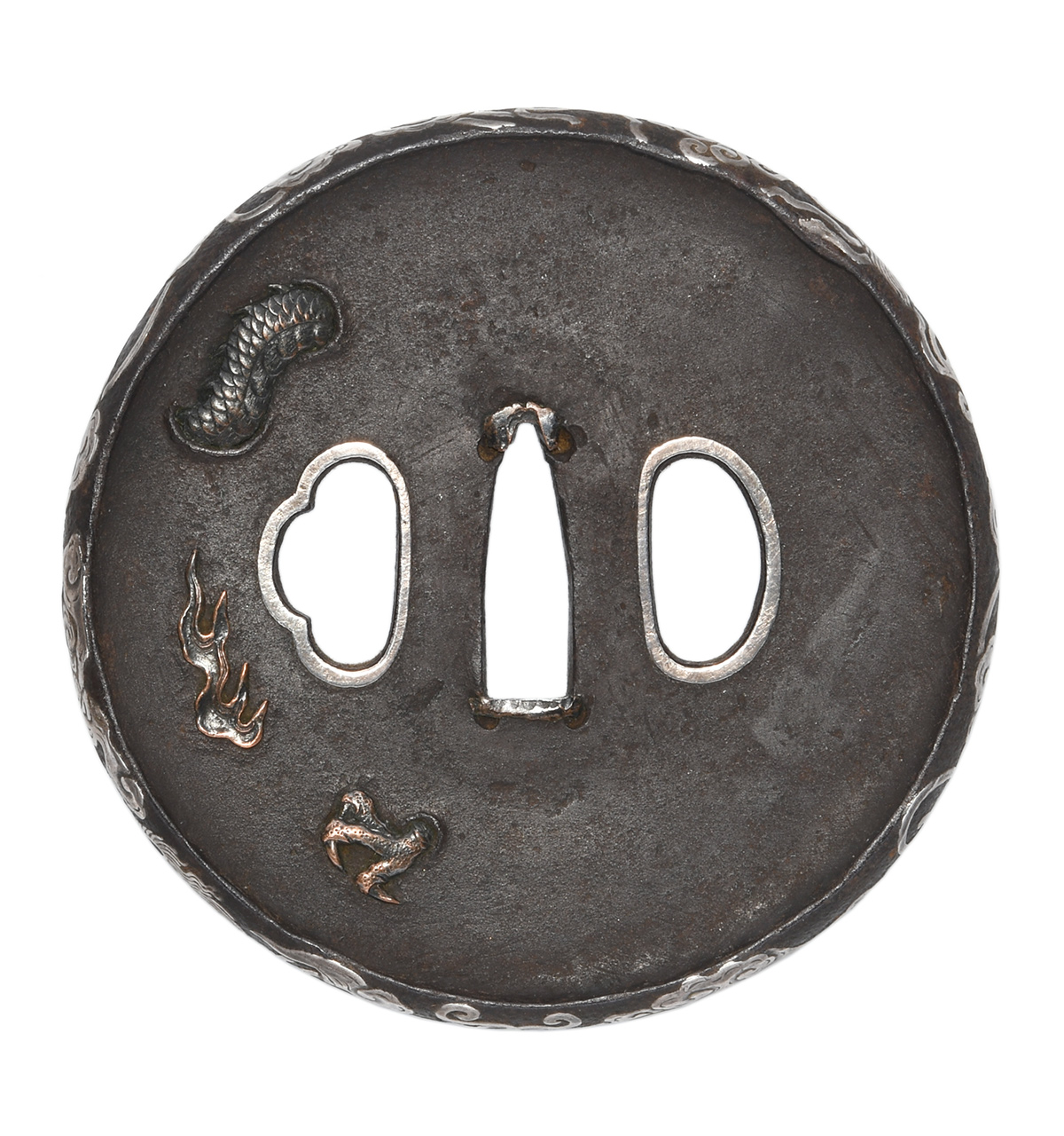 潜龍図鍔 丸形 鉄磨地 鋤出高彫 象嵌色絵 象嵌桶底耳 |