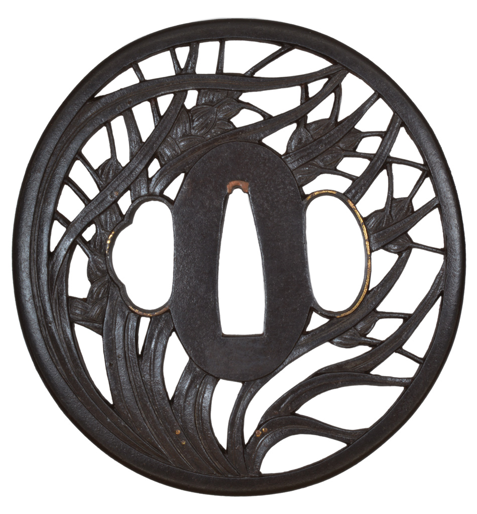 稲穂透鍔 竪丸形 鉄地 肉彫地透 象嵌色絵 象嵌 丸耳 縦:Length: 8.06cm 横:Width: 7.66cm 切羽台厚:Thickness: 0.58cm 重量:Weight: 108g