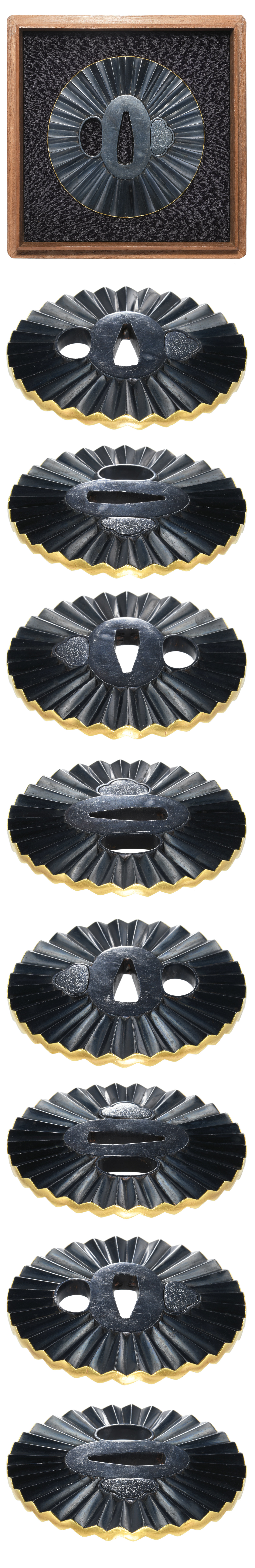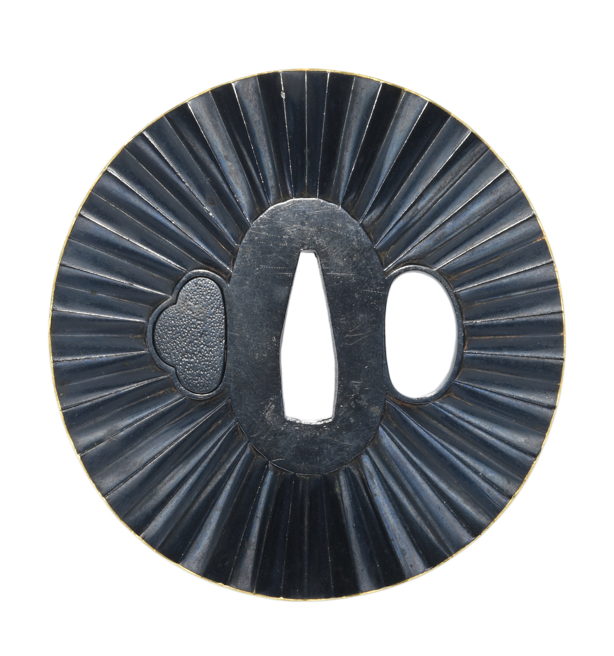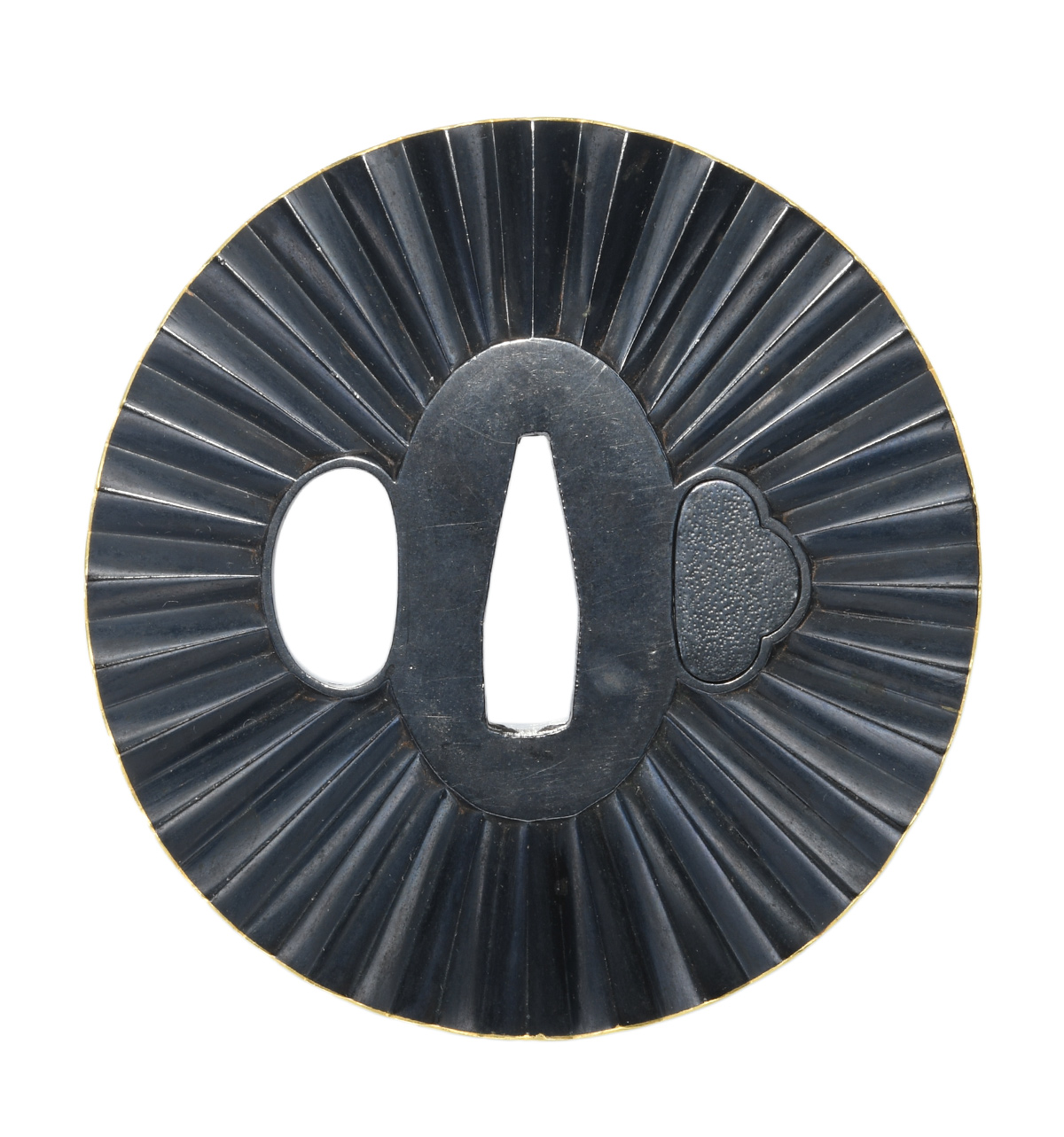 折目模様図鍔 竪丸形 赤銅磨地 鋤出彫 色絵覆輪耳 |