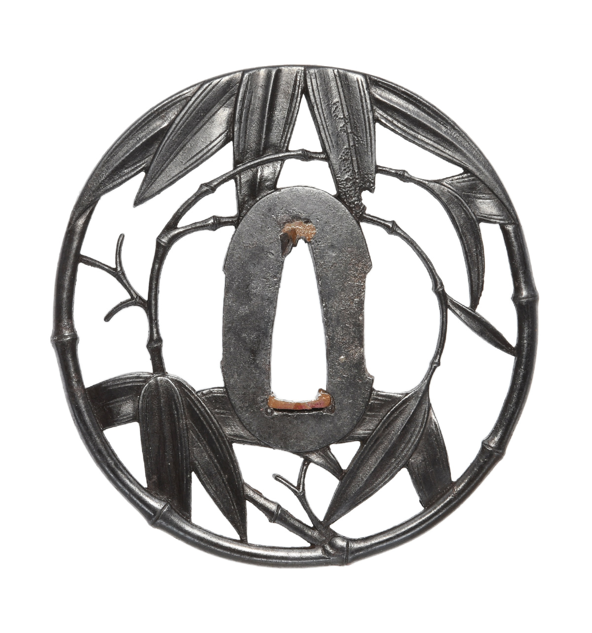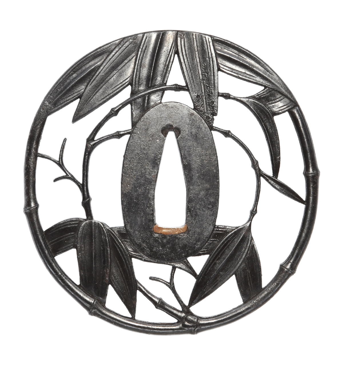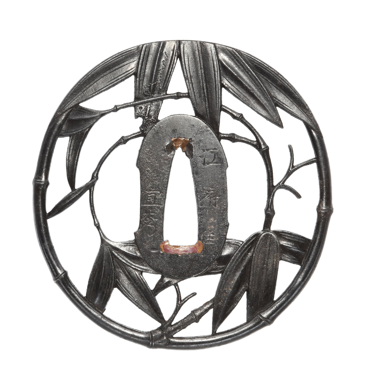 竹透鍔 竪丸形 鉄地 肉彫地透 角耳小肉 肉彫耳 (小)両櫃仕立 【大鍔】