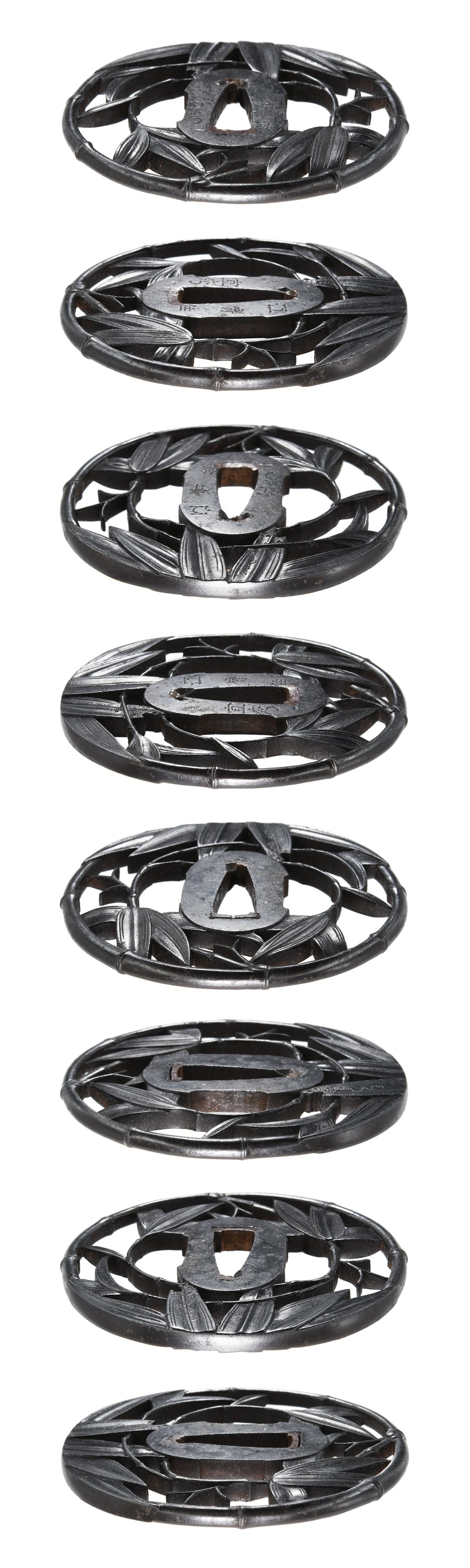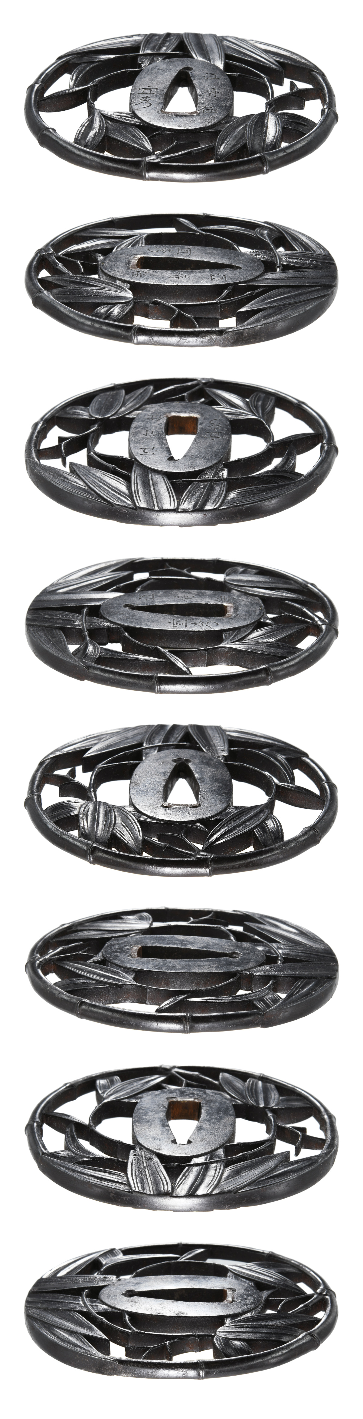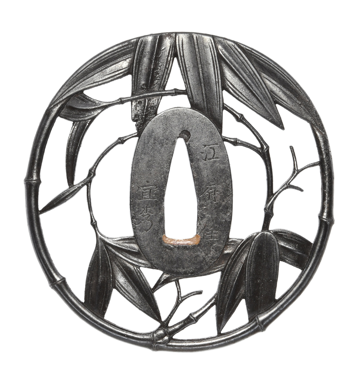 竹透鍔 竪丸形 鉄地 肉彫地透 角耳小肉 肉彫耳 (小)両櫃仕立 【大鍔】