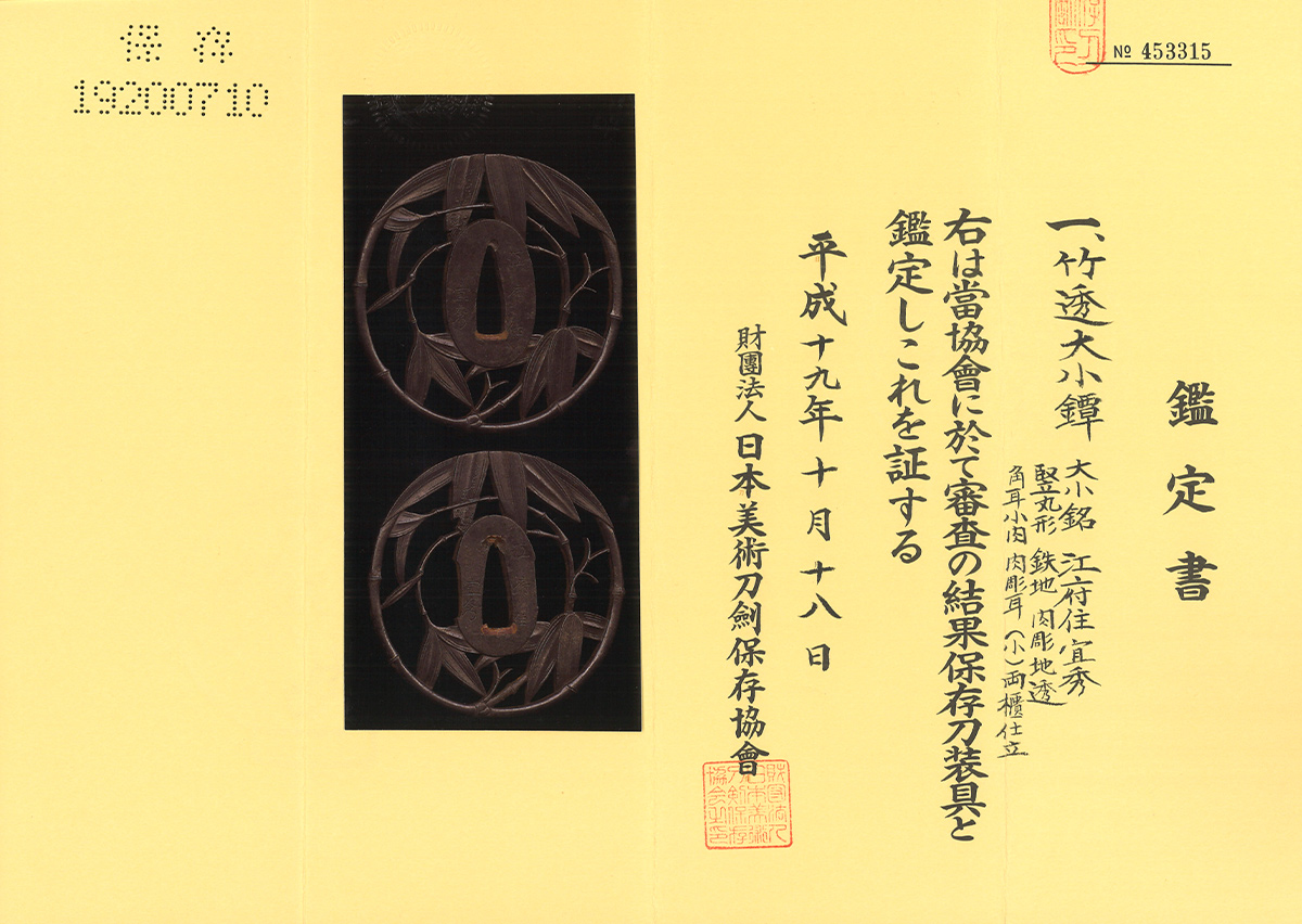 大小鍔 銘 江府住宜秀 竹透鍔 保存刀装具鑑定書