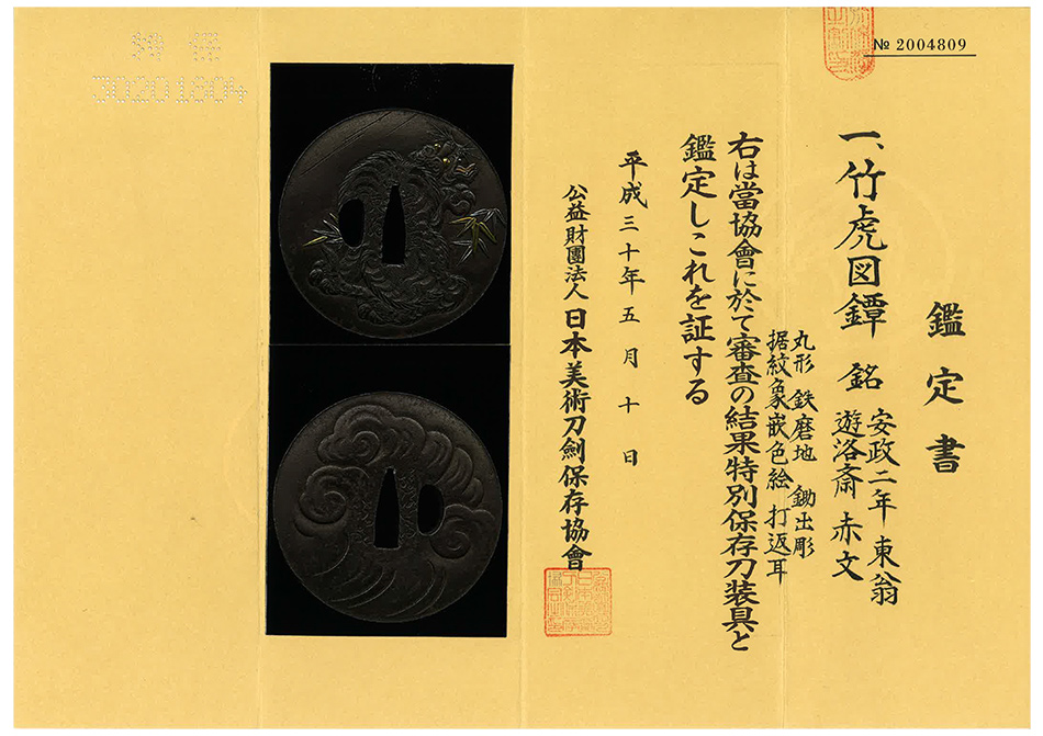 鍔 銘 遊洛斎赤文 安政二年東翁 竹虎図 特別保存刀装具鑑定書