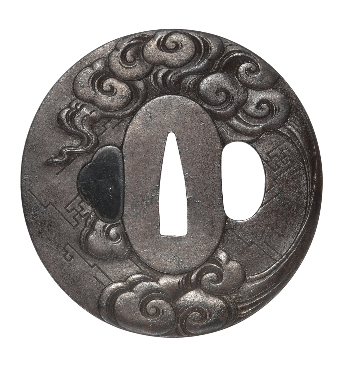 雷雲図鍔 竪丸形 鉄地 鋤出毛彫 角耳小肉 |