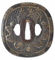 菊桐蝶唐草図鍔 竪丸形 鉄槌目地 鋤出彫 象嵌 丸耳 縦:Length: 8.5cm 横:Width: 7.96cm 切羽台厚:Thickness: 0.43cm 重量:Weight: 132g