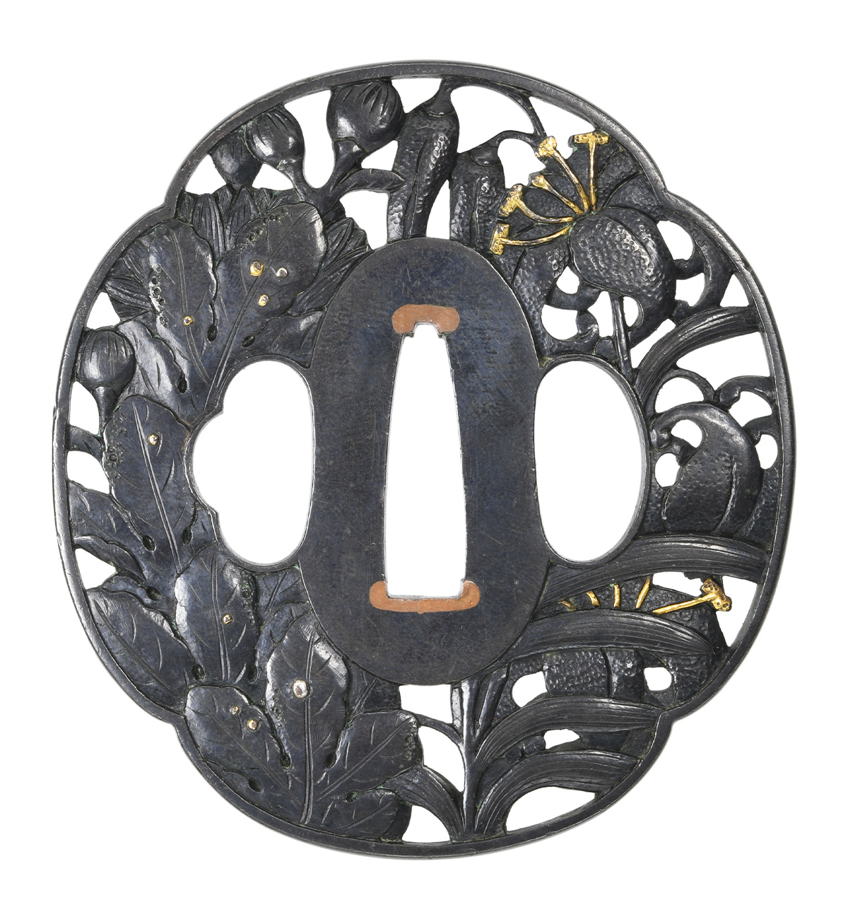 百合菊花図鍔 木瓜形 赤銅磨地 肉彫地透 両櫃孔 丸耳 |