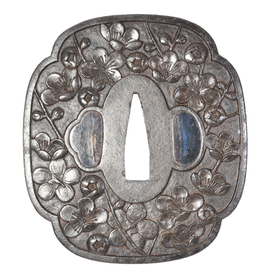 梅花図鍔 木瓜形 鉄地 鋤出彫 鋤残耳 |