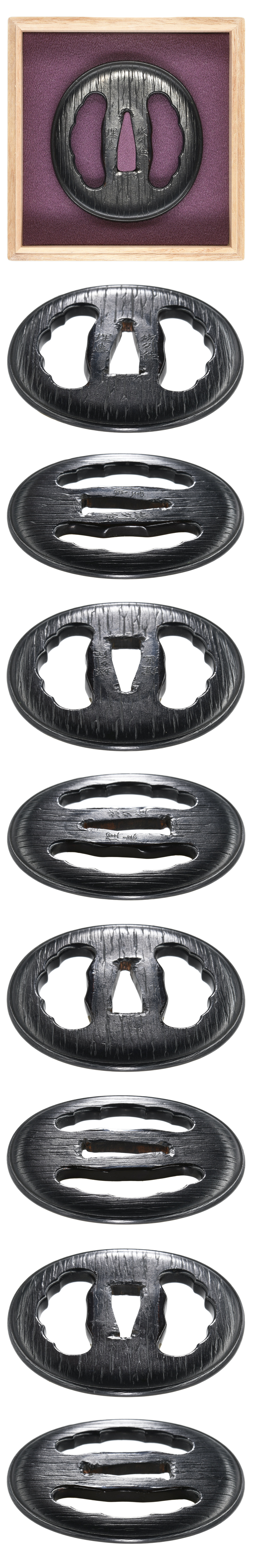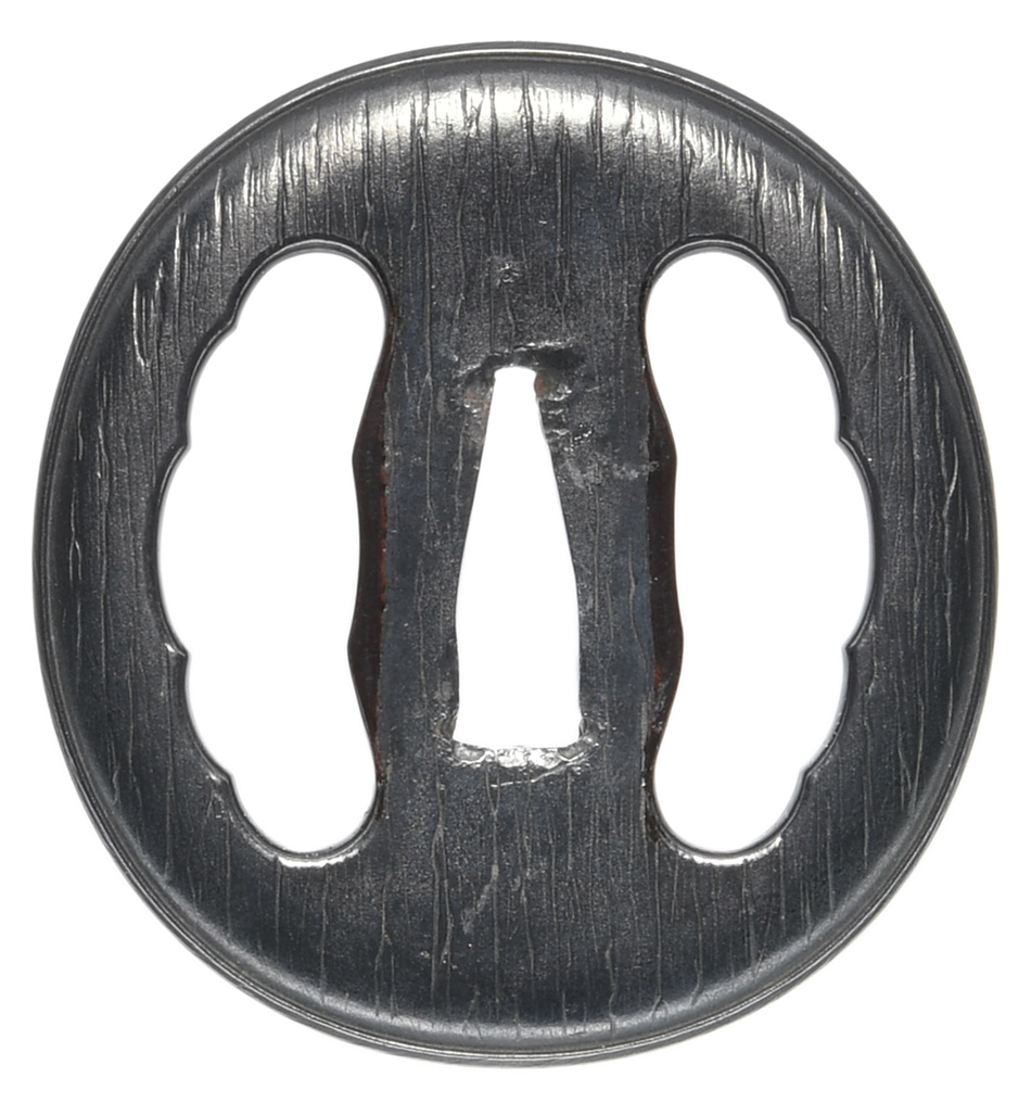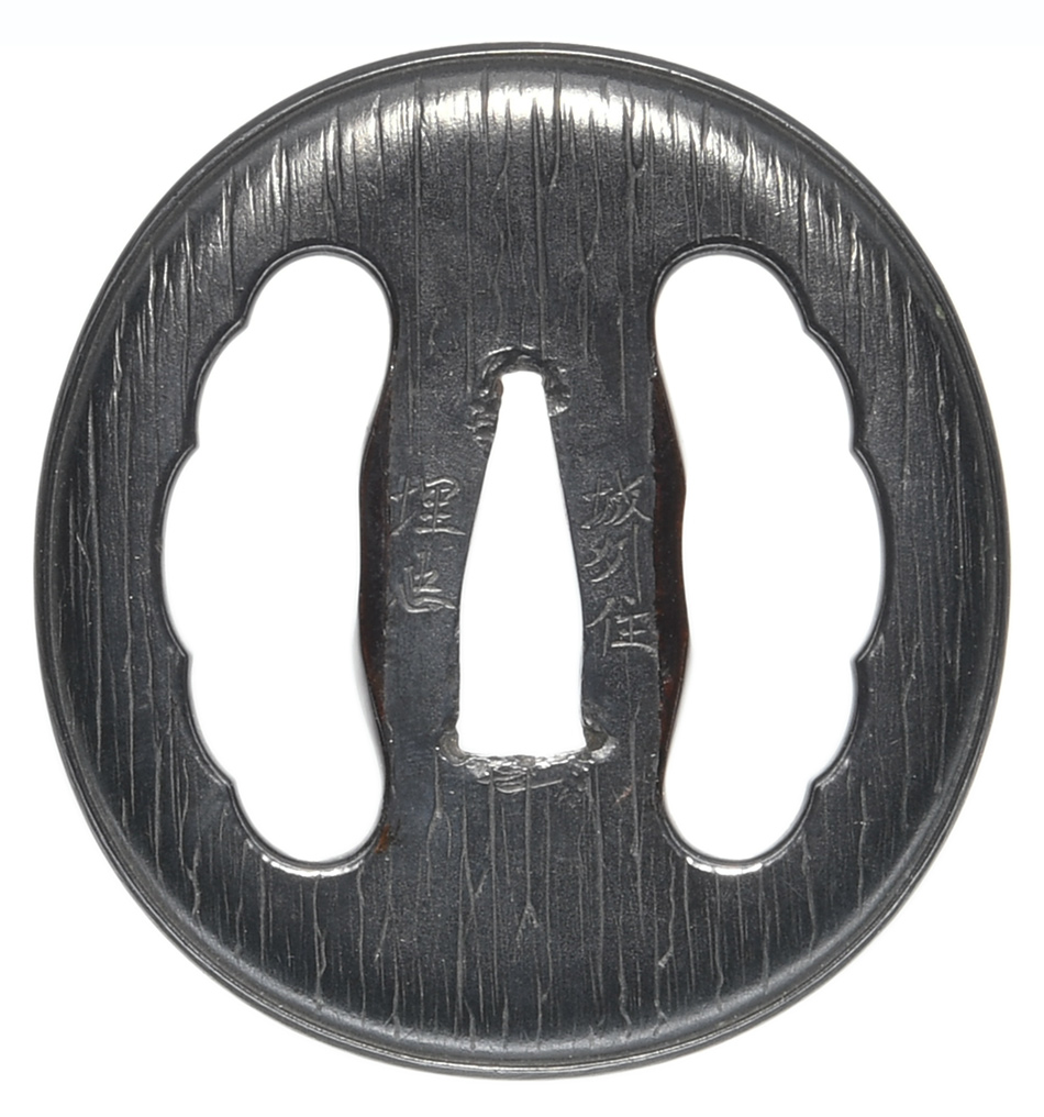 左右松透鍔 竪丸形 赤銅猫掻鑢地 陰透 象嵌色絵 鋤残耳 |