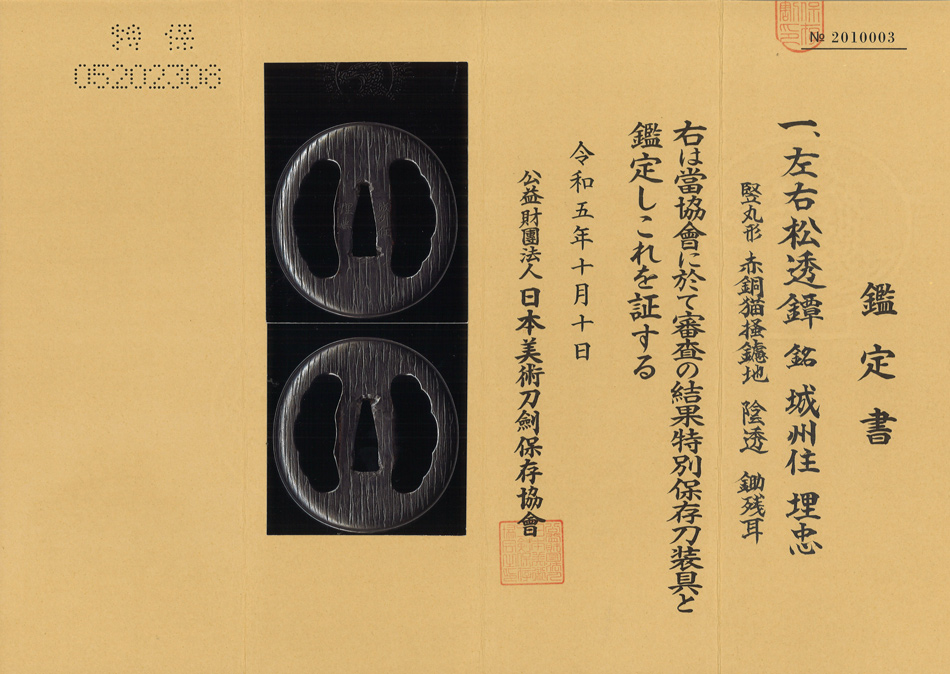 鍔 銘 城州住埋忠 左右松透鍔 特別保存刀装具鑑定書