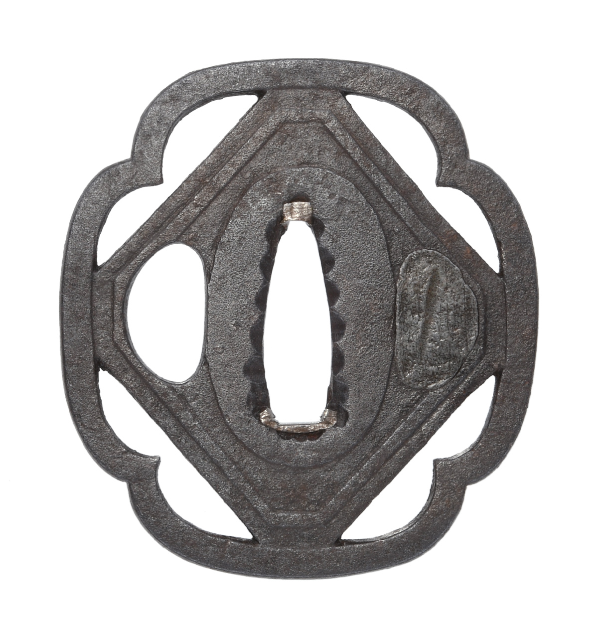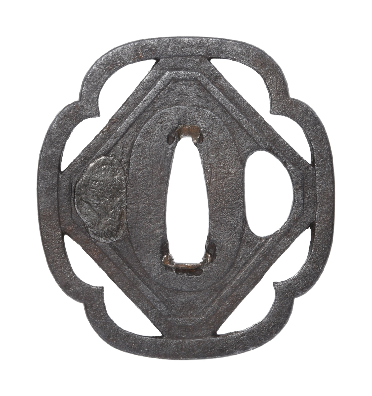 隅切角文透鍔 木瓜形 鉄地 鋤下彫 地透 角耳 両櫃孔(片埋) |