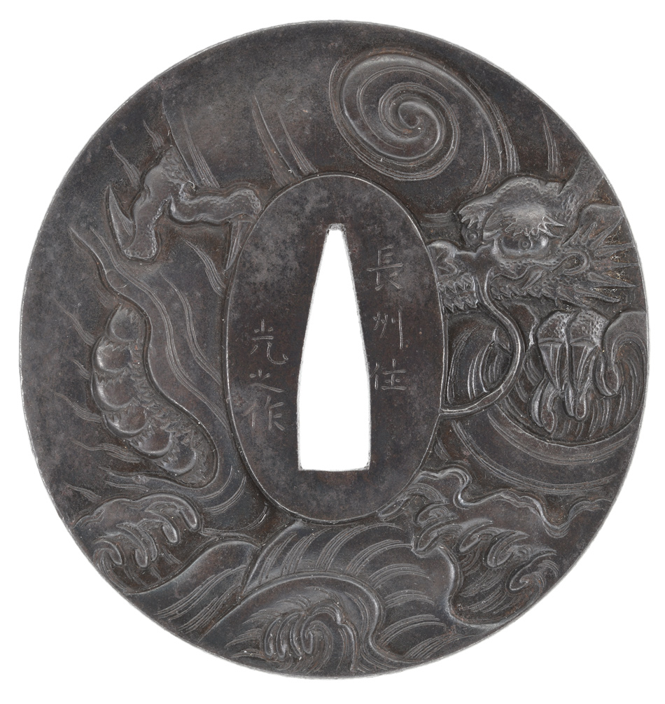 大小鍔 銘 長州住光之作 波濤雲龍図 特別保存刀装具鑑定書