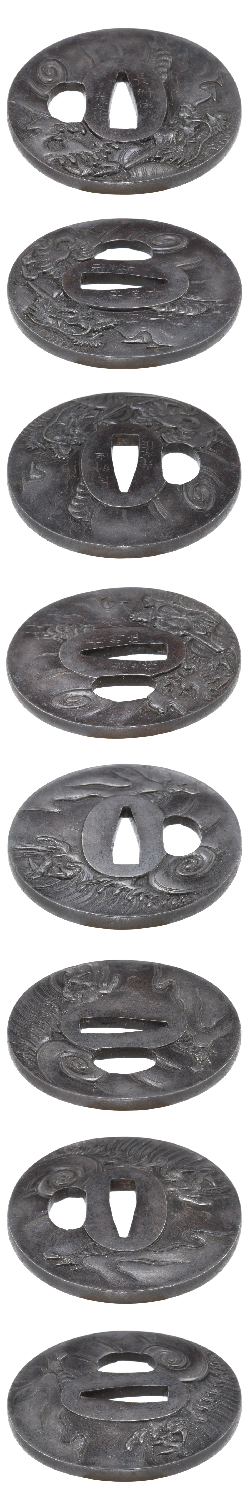 波濤雲龍図 竪丸形 鉄地 鋤出高彫 鋤残耳 【大鍔】