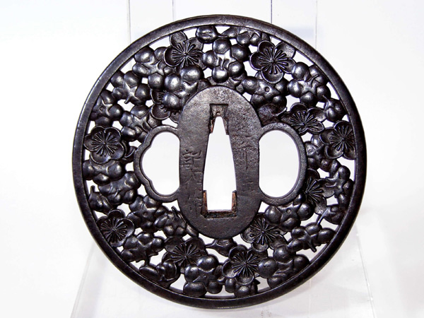 【解説】 記内といえば越前康継の彫刻師として知られ,葵・竜等の肉彫り多く、名人として名高い御人である。紀内の内の字体の癖から,(入記内)と称されている作者である。この人はまた鉄味・技量が紀内各代の中でも群を抜いて優れている為(名人記内)とも呼ばれ、もっとも人気が高い。 作品は艶のある精良な地鉄で黒紫色の錆色が美しい。梅の花を裏表にちりばめて肉彫り透しで表すが、円い鍔面を巧みに利用した心憎い構図取りに光るものがあり、彫技もしごく丁寧かつ上手である。透し鍔は数あれど,これほど高い水準を示すものは希であると思う。 よくご覧いただきたい。また記内作品に本作品の構図は珍しく珍品に値する逸品で、相当に凝ったものである。鉄の艶と潤いには、ただただ感歎を覚えずにはいられない。 |