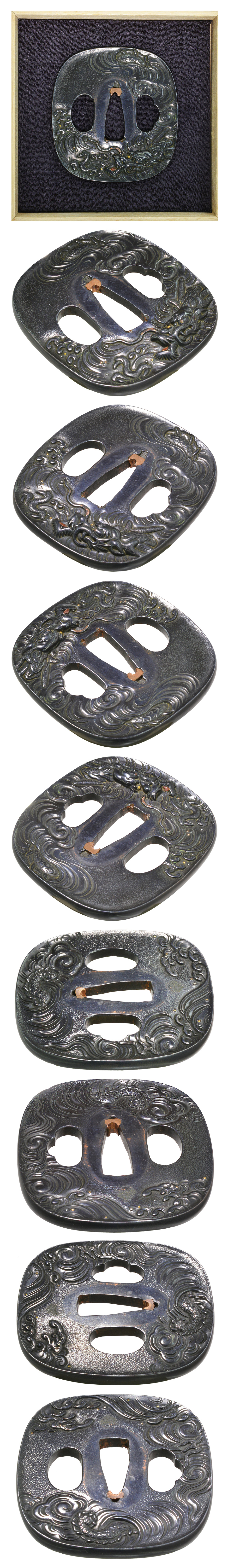 波濤雲龍図鍔 撫角形 四分一石目地 鋤出高彫 象嵌色絵 打返耳 縦:Length: 7.03cm 横:Width: 6.55cm 切羽台厚:Thickness: 0.46cm 重量:Weight: 132g