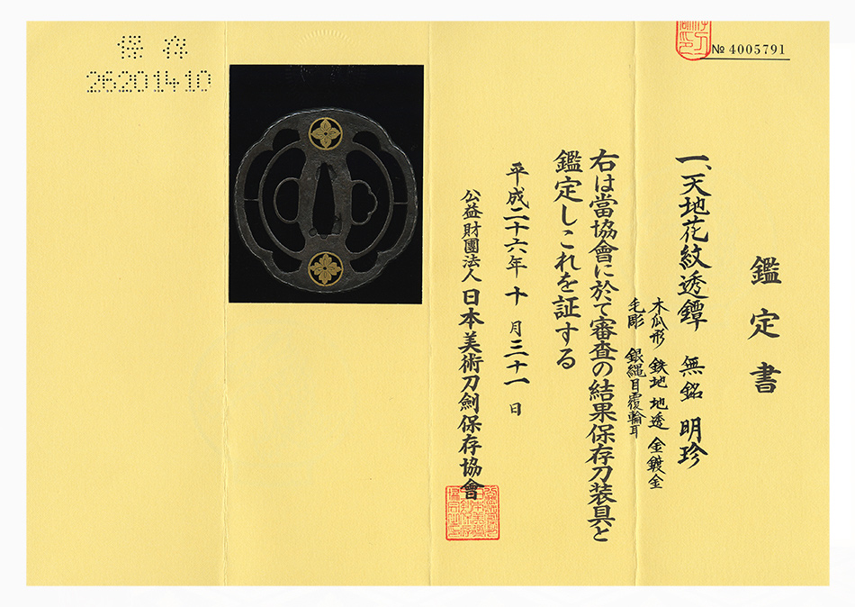 鍔 無銘 明珍 天地花紋透鍔 保存刀装具鑑定書