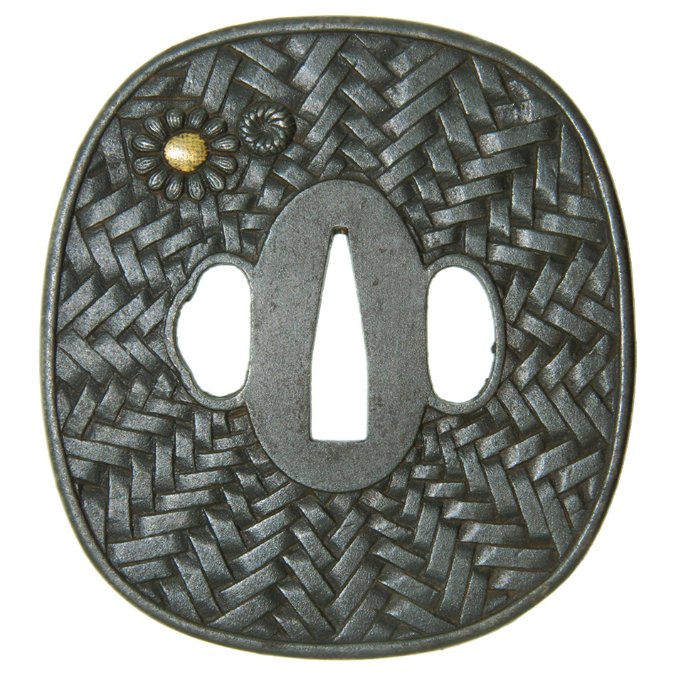 あじろに蝶菊花図 竪丸形 鉄磨地 鋤彫 金色絵 両櫃孔