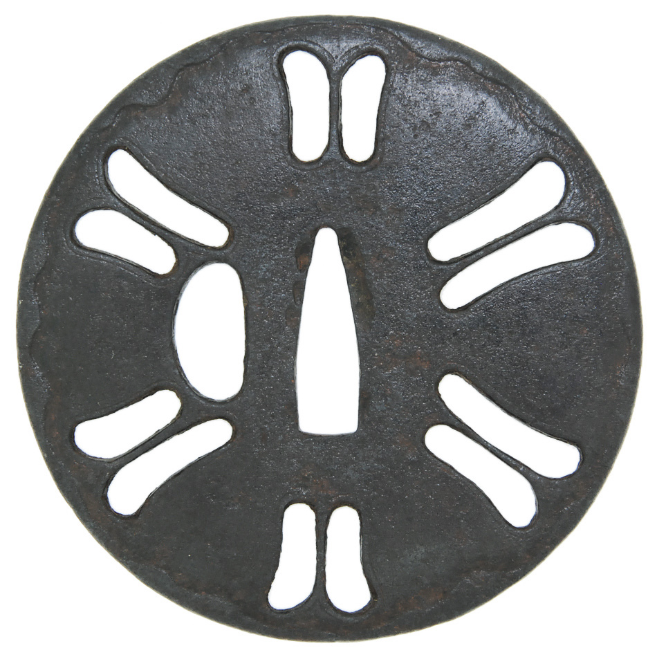 六方軍配透鍔 丸形 鉄地 陰透 毛彫 鋤残耳
