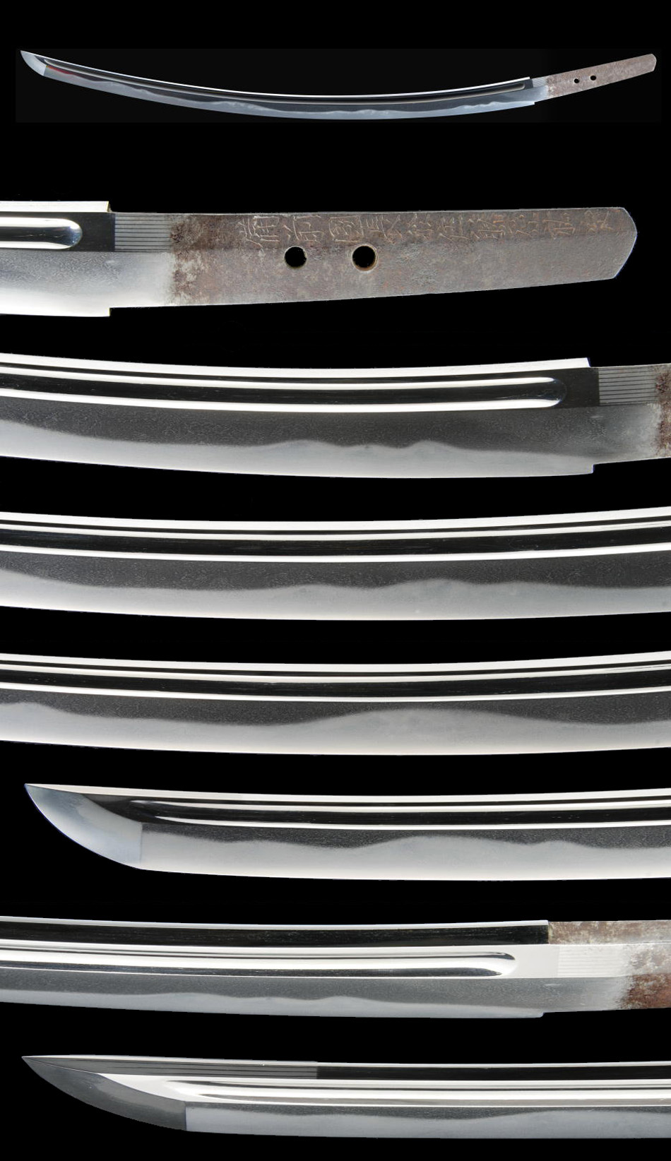 刃長:Blade length(Cutting edge): 58.0cm(一尺九寸一分) 反り:Curve(SORI): 3.4cm 体配:Shape(Taihai): 鎬造、庵棟、中切っ先。 |