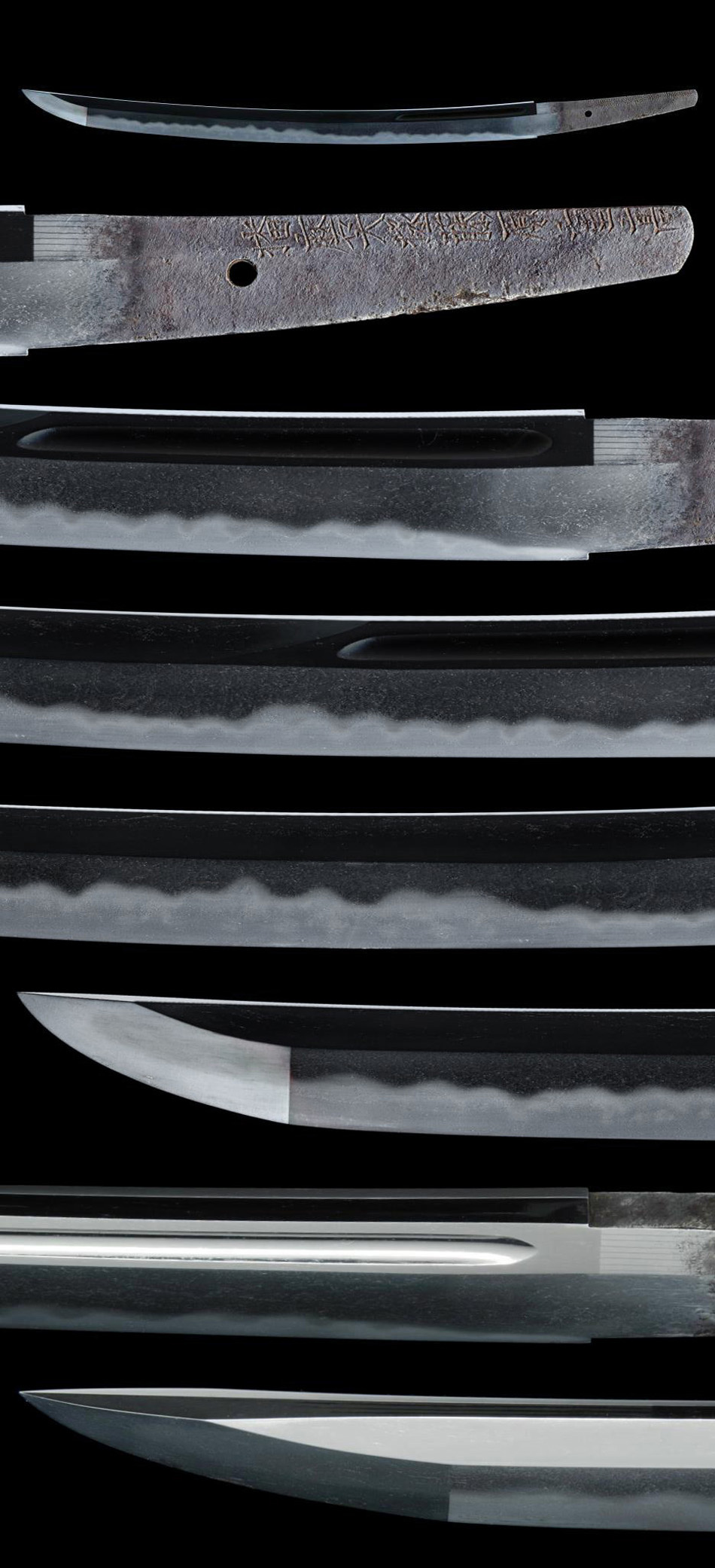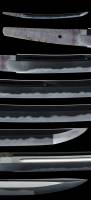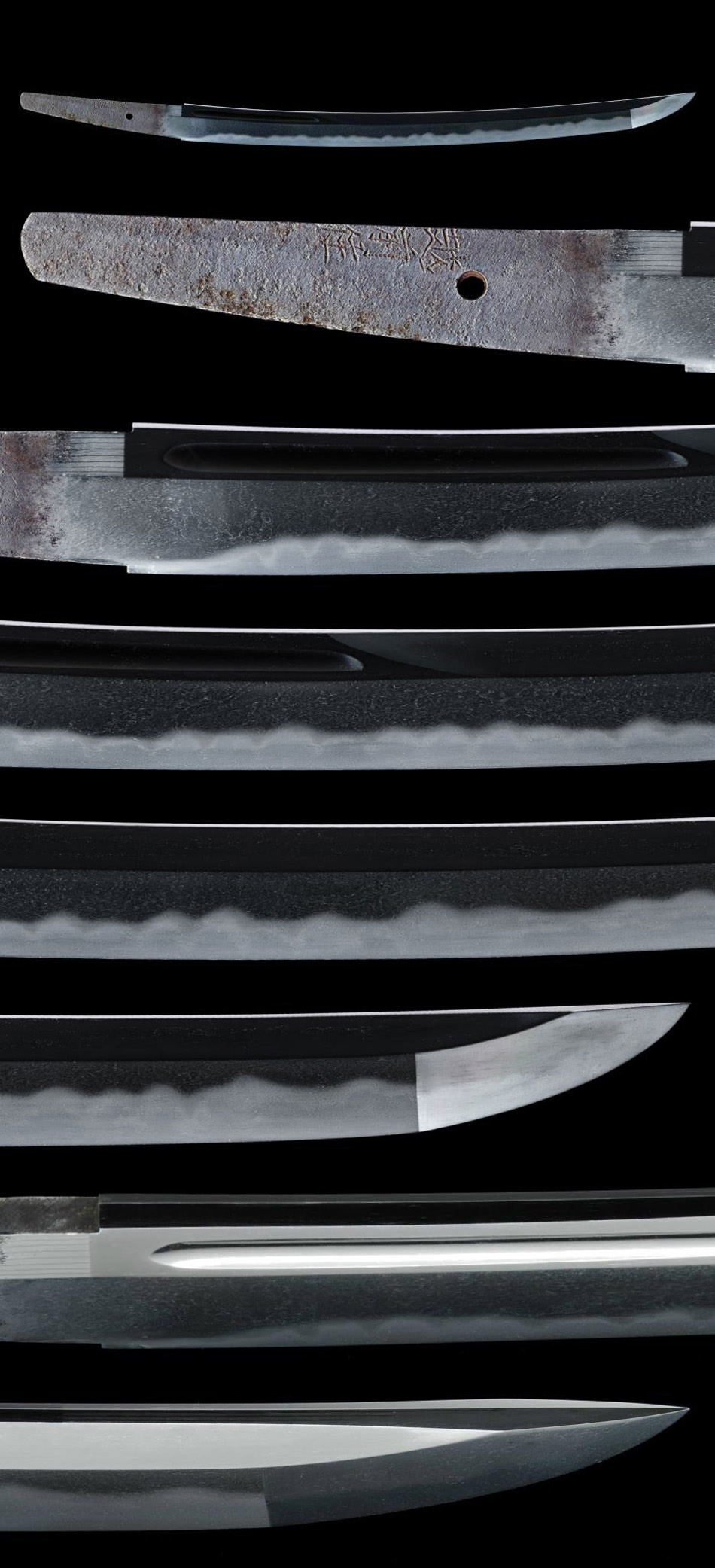 刃長:Blade length(Cutting edge): 48cm(一尺五寸八分四厘) 反り:Curve(SORI): 1.2cm 体配:Shape(Taihai): 鵜の首造、大切っ先。 |