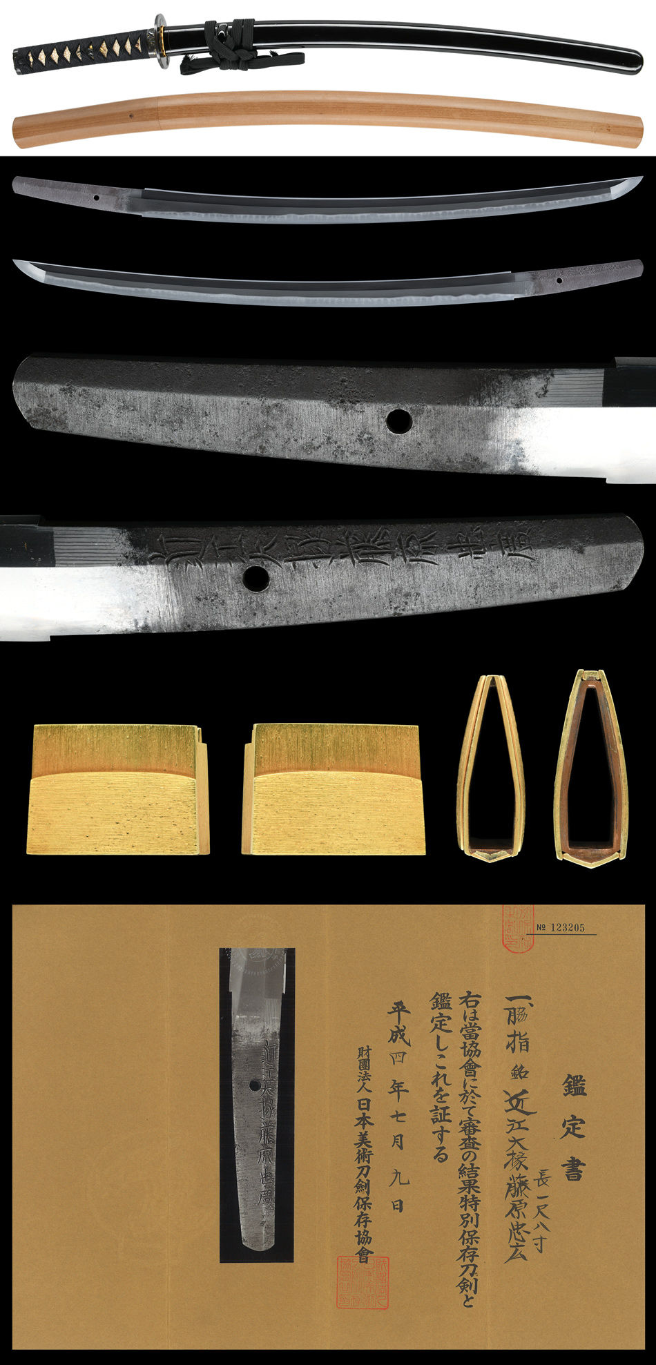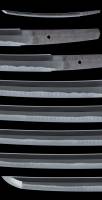 刃長:Blade length(Cutting edge): 55.0cm(一尺八寸) 反り:Curve(SORI): 0.9cm 元幅:Width at the hamachi(Moto-Haba): 3.20cm 元鎬重:Thickness at the Moto-Kasane: 0.74cm 先幅:Wide at the Kissaki(Saki-Haba): 2.55cm 先鎬重:Thickness at the Saki-Kasane: 0.60cm 拵全長:約77.5cm 茎:Sword tang(Nakago): 切鑢目、目釘孔1個。