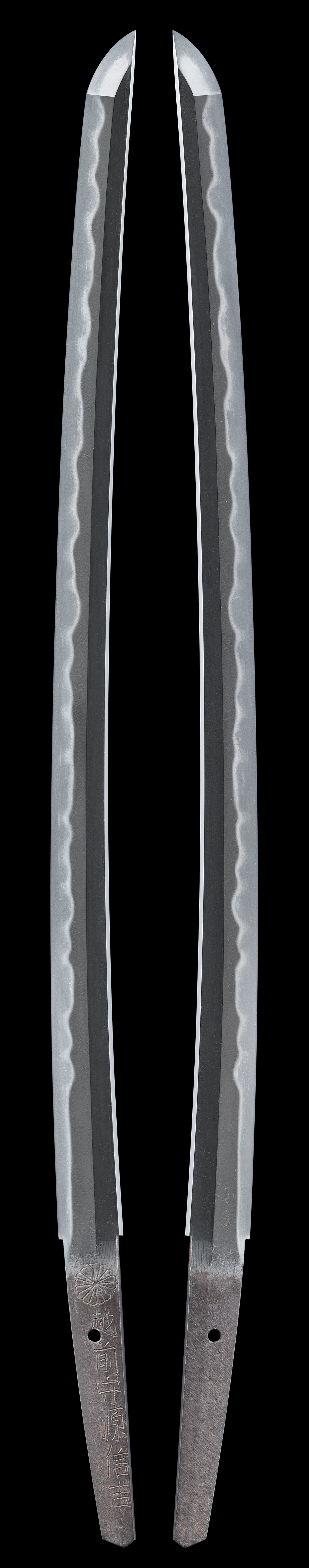 江戸時代中期、山城国(京都府)出身の良工 越前守源信吉の優刀です。華麗な互の目乱れが焼かれ、拵と合わせて長くお楽しみいただける御刀としてご紹介いたします。