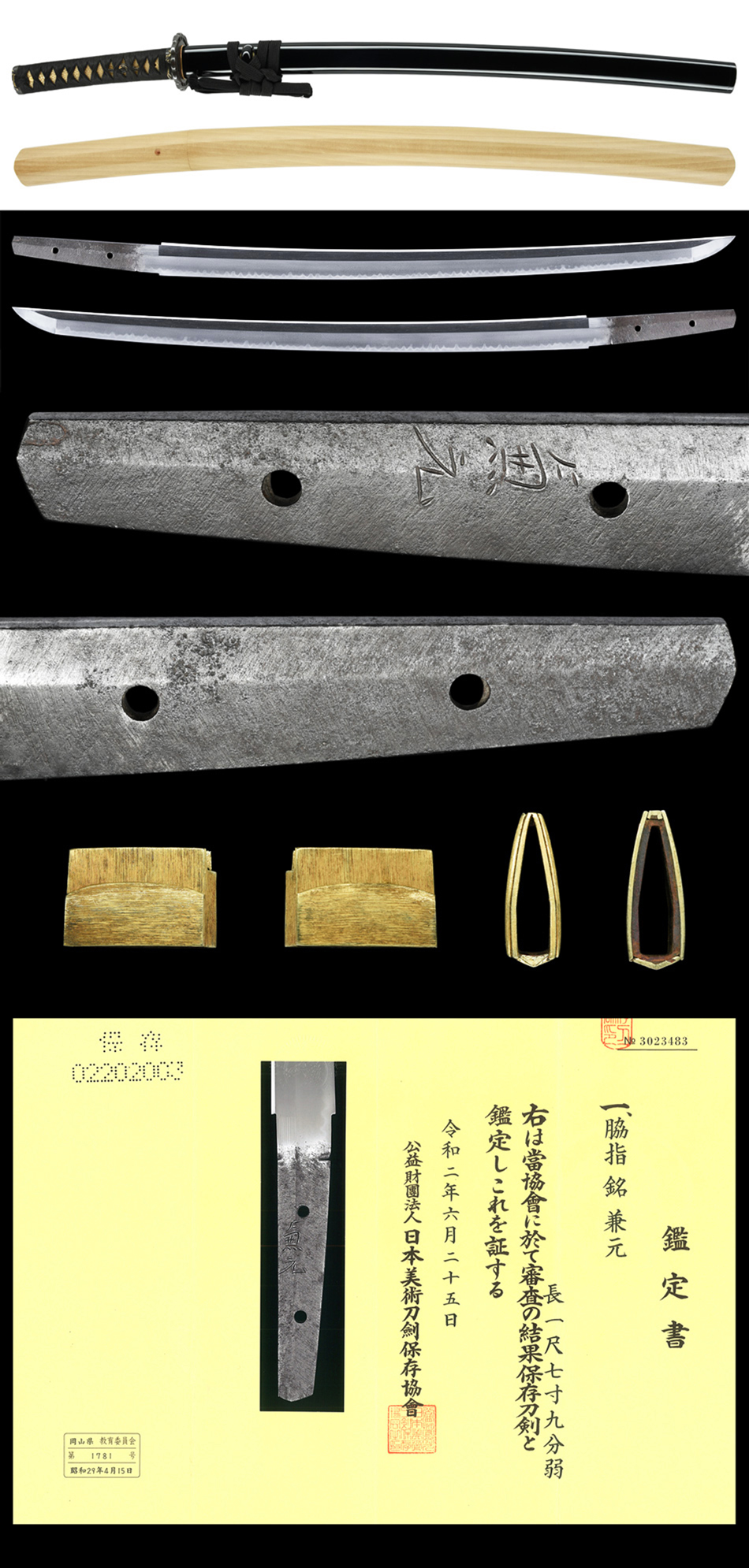 刃長:Blade length(Cutting edge): 55.4cm(一尺七寸九分弱)反り:Curve(SORI): 1.2cm |