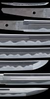 体配:Shape(Taihai): 鎬造、庵棟、中切先。 彫物:Engraving: 表に腰樋、裏に護摩箸の彫刻。 地鉄:Jigane(Hada): 小板目肌。 刃文:Temper patterns(Hamon): 濤欄刃風大互の目乱れ。 帽子:Temper patterns in the point(Bohshi): 湾れて先小丸へ返る。 登録:Registration Card: 福岡県