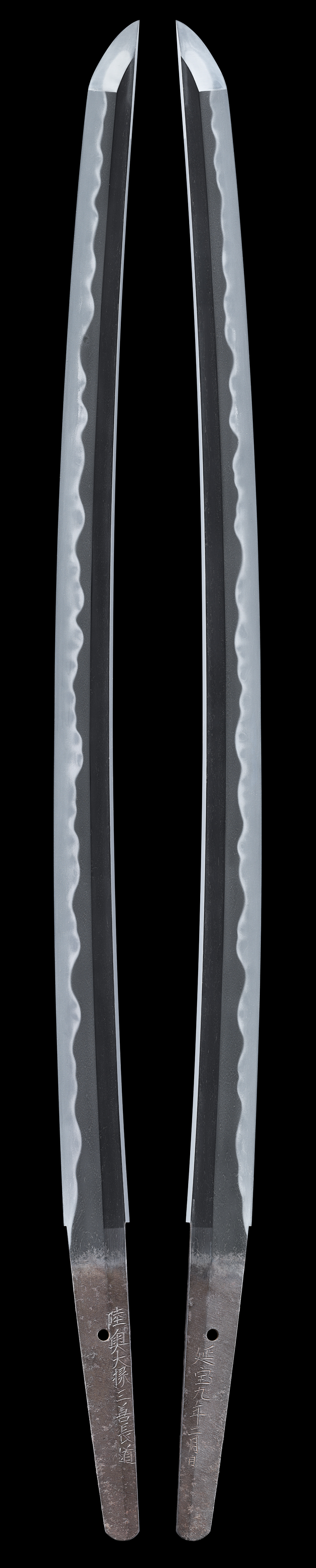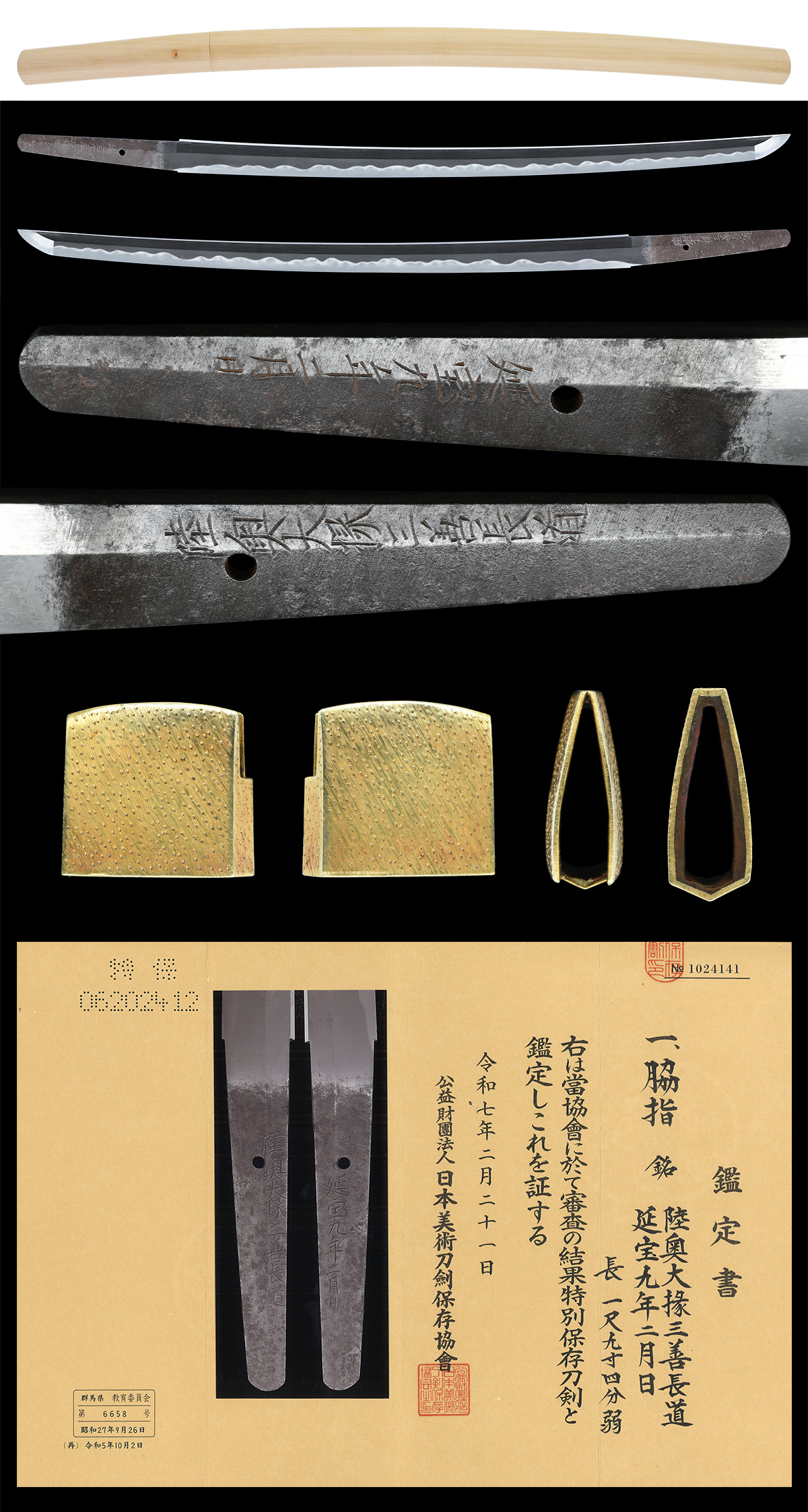 【解説】 会津の三善一族は長国を祖とし、その子政長から長道へと代々続く陸奥刀匠の名家です。上京し肥前忠吉と同じく埋忠明寿に学んだ為に山城伝の趣強く、寛永四年(1627年)より父長国と共に会津で鍛刀。美濃から移住してきた兼定一派と双璧の三善家はこのときより始まります。政長の子三善長道は、寛永十年(1633年)会津生まれです。会津正宗、会津虎徹とも称され、出来は虎徹にやや類似し、斬れ味の良さは後代まで引き継がれています。長道系は十代(明治)まで会津鍛冶の棟梁としての地位を保っています。同工長道は寛文・延宝期、初代の作で、名は藤四郎、叔父長俊に師事しました。はじめ道長と銘を切り、万治二年に陸奥大掾を受領後、三善長道と改めます。津田助廣の弟子という説もあります。作品は奥州一の名工と称されるに申し分なく、新刀上作、最上大業物に列します。刀銘は、陸奥大掾藤原長道三善藤四郎、長道、陸奥大掾三善長道、三善陸奥守藤原長道藤四郎、などと銘切ります。寛永十年(1633年)会津生まれ、貞享二年十一月十七日(1685年)没。 本作体配は、刃長が一尺九寸四分弱と、刀に迫る長脇差で、身幅広く、重ね尋常、反り適度で中切っ先となる健全な刀姿の一口です。地鉄はよく練れた精良な小板目肌鍛に、地沸が微塵に付き、細かく地景が入る精緻な鍛となります。刃文は、互の目を主として丁子、尖り刃、湾れ交じり、処々腰開いて高低がつき、刃縁に小沸がふんわりと付いて匂口明るく冴えます。帽子は直ぐとなり、先小丸に返ります。茎は生ぶ、筋違鑢目で刀工銘と年紀を刻します。新刀期、会津を代表する名工 初代三善長道、延宝九年の御刀。小板目肌精緻で潤い、沸匂深く、明るく冴えた見事な刃を示す同工の貴重な優品です。白鞘、金着一重はばき、特別保存刀剣鑑定書。