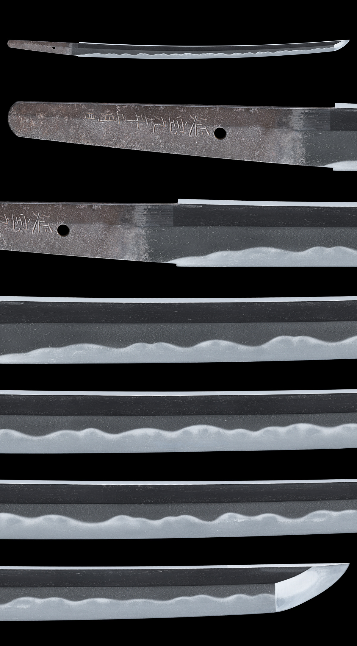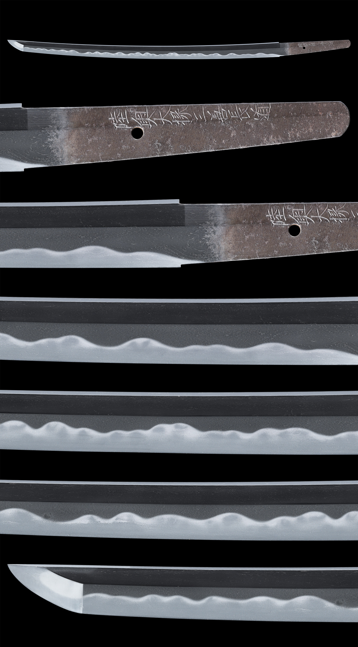 体配:Shape(Taihai): 鎬造、庵棟、中切っ先。 地鉄:Jigane(Hada): 小板目肌、地沸微塵に付き、地景入る。 刃文:Temper patterns(Hamon): 互の目を主として丁子、尖り刃、湾れ交じる。 帽子:Temper patterns in the point(Bohshi): 直ぐで先小丸に返る。 登録:Registration Card: 群馬県 昭和二十七年