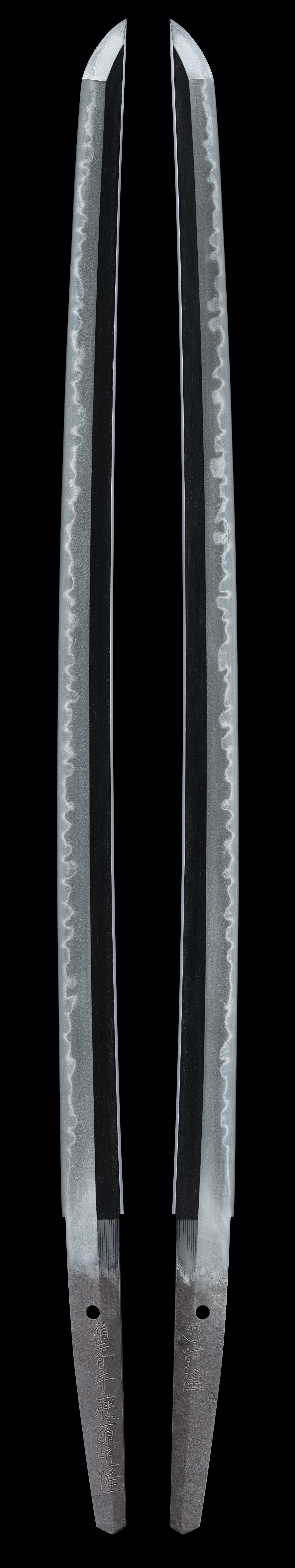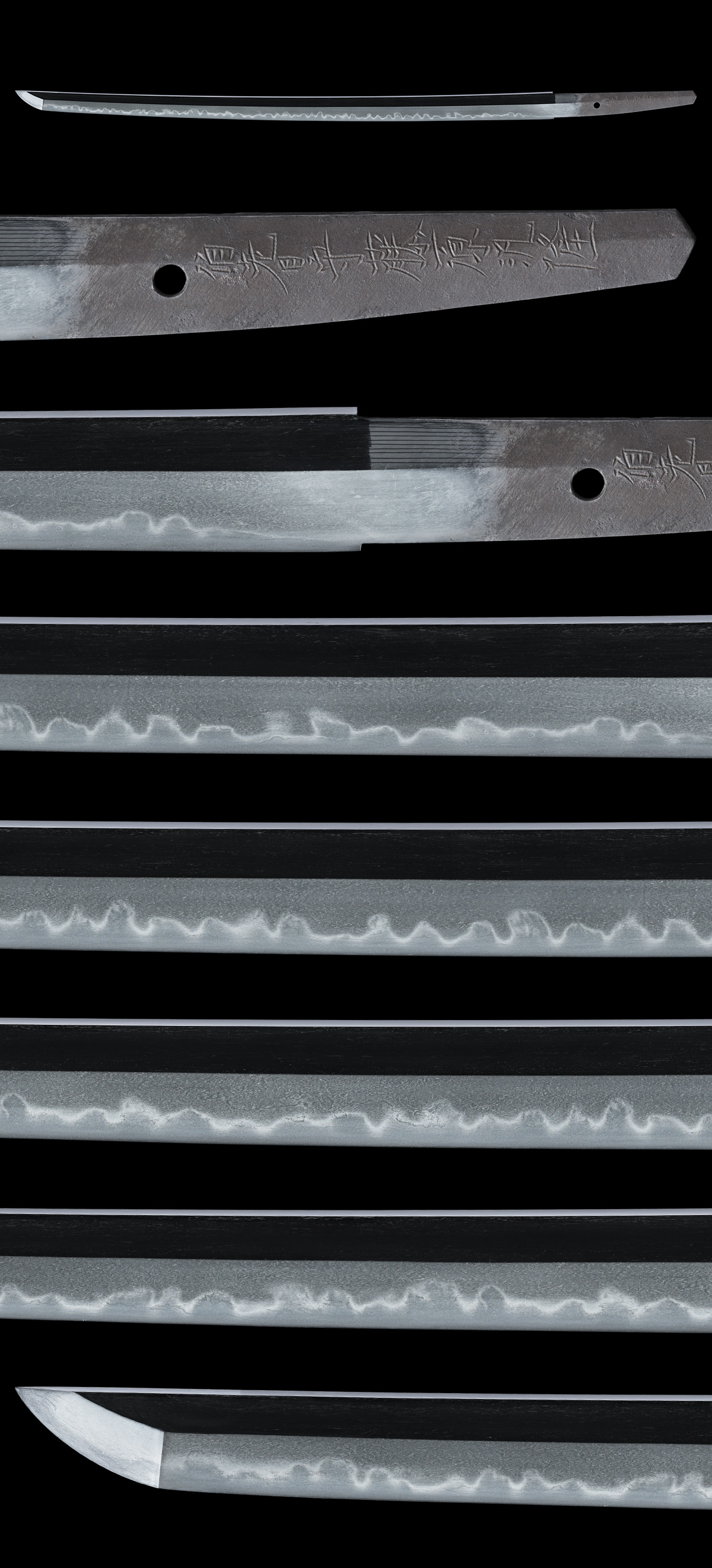 体配:Shape(Taihai): 鎬造、庵棟、中切っ先。 地鉄:Jigane(Hada): 板目肌詰んで杢目交じり、地沸付き、地景入る。 刃文:Temper patterns(Hamon): 互の目に丁子、尖り刃、角ばった刃などを交える。 帽子:Temper patterns in the point(Bohshi): 浅く乱れ、先掃きかけて返る。 登録:Registration Card: 山形県 昭和三十二年