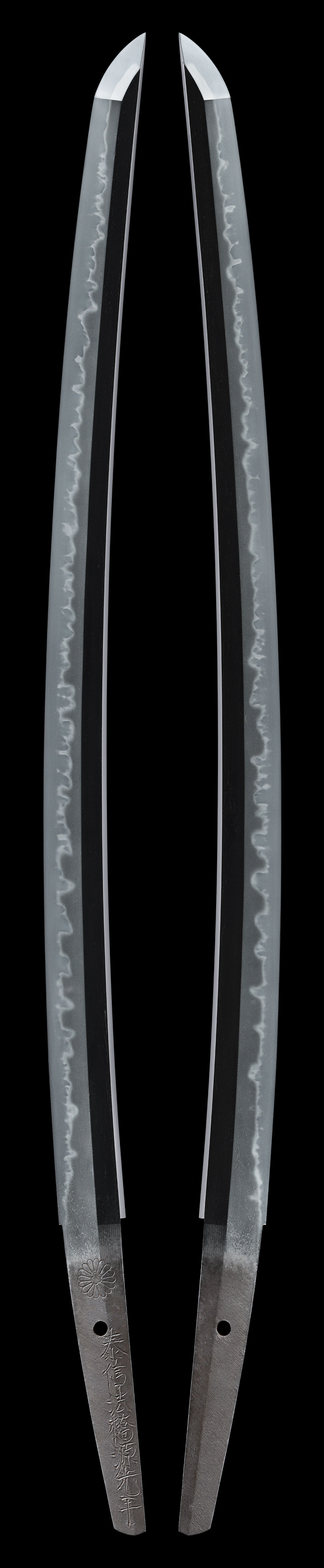 江戸石堂鍛冶の代表である日置光平の一口。古作一文字の作風を高い技量をもって顕現させ、出入りの激しい誠に華やかな丁子乱れをみせます。