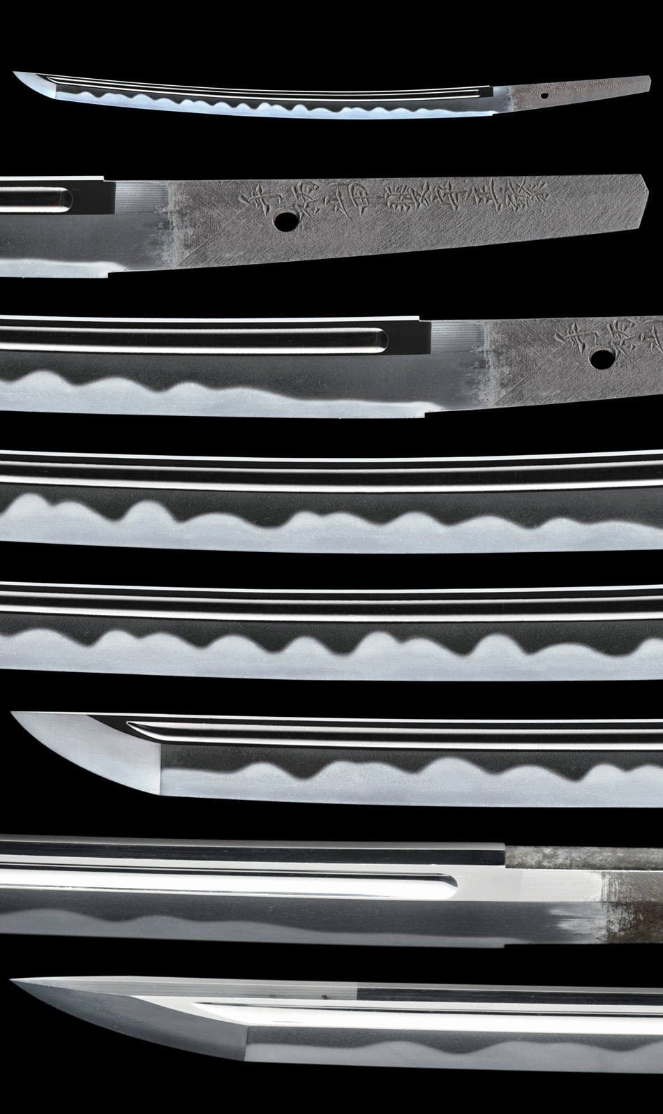 【解説】正繁(1760‐1830)は播磨(兵庫県)手柄山、姫路の刀工。宝暦10年生まれ。手柄山四代氏繁の子、兄五代氏繁を助けて、大阪に出て鍛刀し自ら六代氏繁を名乗ります。京都御所が炎上した天明8年(1788)の冬、大阪に立ち寄った奥州白河藩主松平定信(楽翁候)に召し抱えられました。この時氏繁30歳。江戸に出た氏繁は名を手柄山正繁と改めます。享和3年(1803)47歳で甲斐守を受領、晩年定信(楽翁候)より「神妙」の二字を賜ります。文政13年7月5日、71歳で死去。当時流行の大乱れの濤爛刃を焼くのを得意とし津田越前守助広に私淑した刀工として名を挙げました。刻銘は、手柄山甲斐守正繁、手柄山正繁、奥州白河臣手柄山正繁、などと切ります。手柄山正繁は今日、非常に人気が高い刀匠です。 |