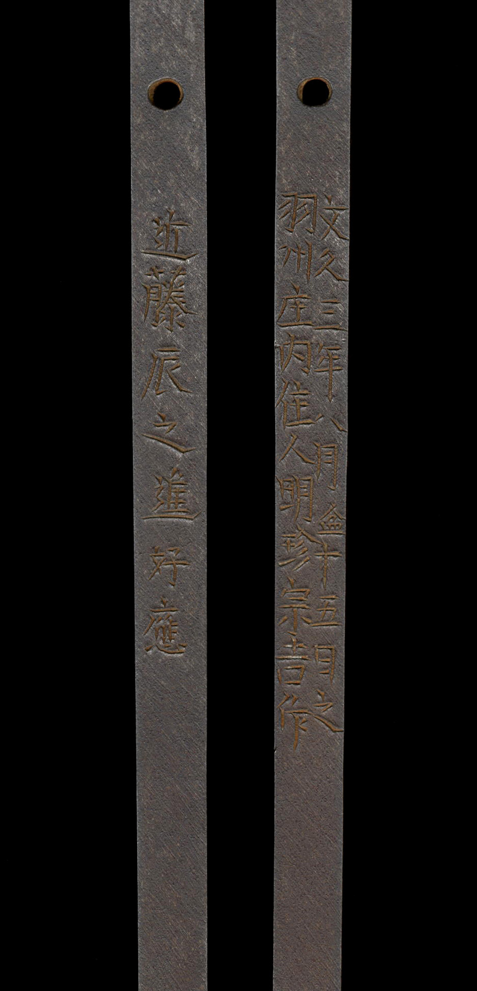 【解説】本作は甲冑師として高名な明珍一派の宗吉の大身槍です。甲冑、鍔の在銘品は現存しておりますが、刀、槍の類は希であり、年紀と需要銘も入っており資料として考えただけでも大変価値ある逸品です。羽州庄内の住人で本名は益田氏。 作品は、なんと刃長が三尺三寸七分三厘(102.2センチ程)もあり茎の長さが87.6センチ。と大変見事な大身槍になります。これだけ大振りな大身槍は目にしたことが無く、製作された当時でも恐らく話題になったであろう代物です。地鉄は小板目肌で、鍛えは整い地沸が付きます。刃文は直ぐで互の目交じる小沸出来です。帽子は小丸へ素直に返っています。茎は丁寧な仕上げになり、立派な銘が入っています。整然と刻された銘を見るに感銘を覚えずにはいられないほどです。裏に近藤辰之進好応と有ります。この御方がどのような御方であったのかは今後研究されていくと面白いと思います。拵は後作でありますが、大変似合っていて飾って立派なものです。先にも解説しましたが、甲冑師として名高い明珍宗吉が鍛錬した槍です。時代の甲冑師は鍔やら鉄砲やら、そして本品のように槍までお造りになられ、つくづくと器用であったのだろうと関心せずにはいられません。明珍、名前の通り、珍品です。珍品中の大珍品。お見逃し無く御願いします。研磨は古いですが、急ぎ手を掛けることは無いと思います。